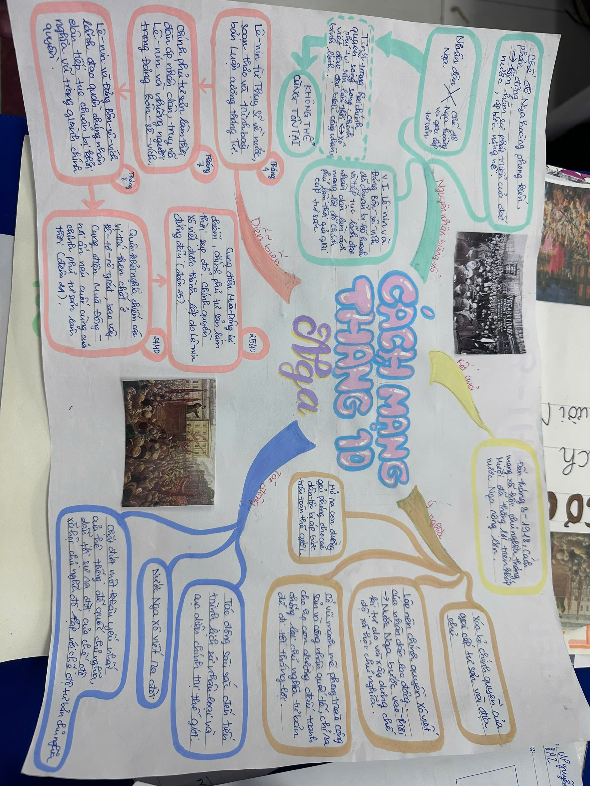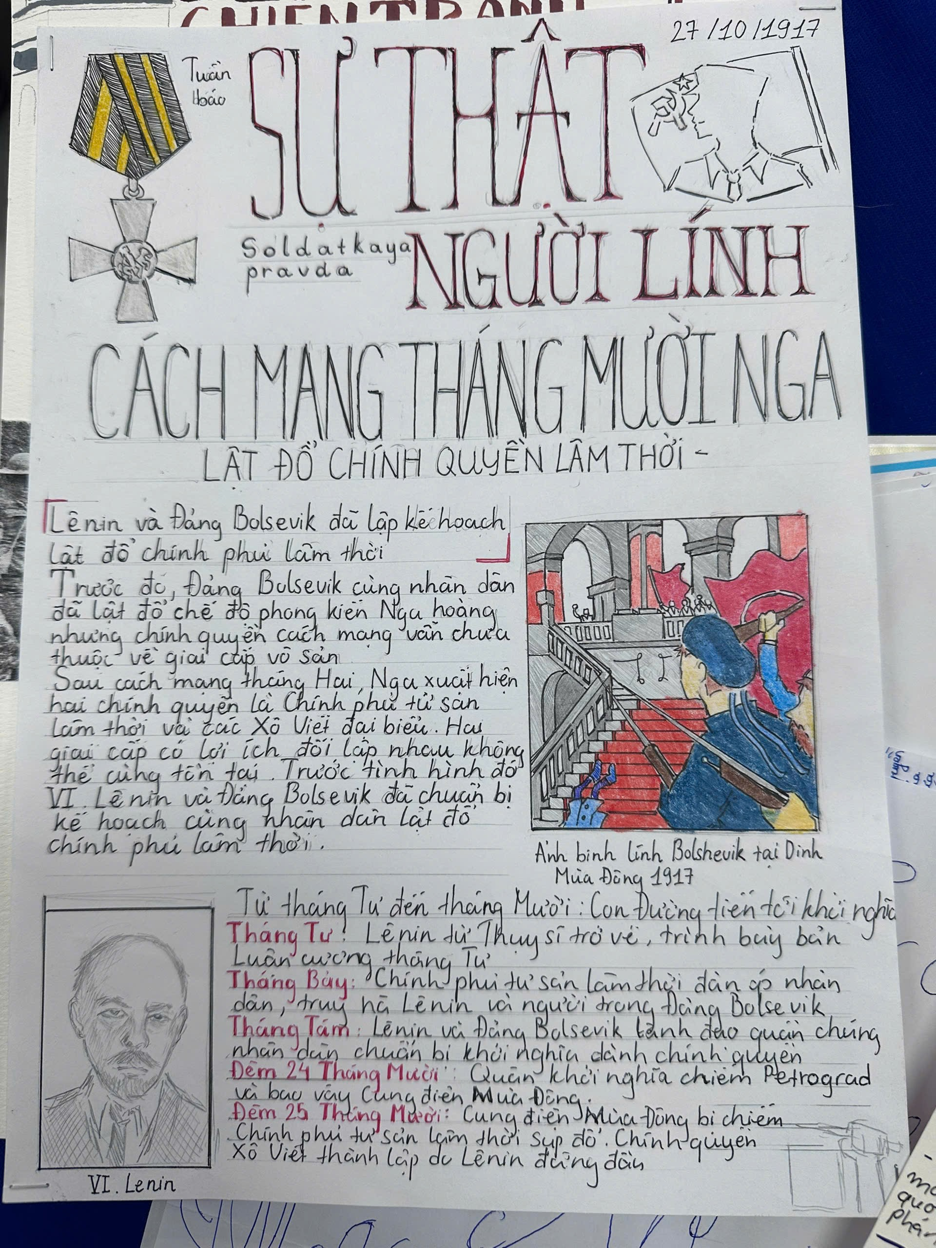 Bước vào tiết học, cô giáo đã giao cho mỗi học sinh nhiệm vụ thực hiện sản phẩm cá nhân nhằm trình bày nội dung Cách mạng Tháng Mười Nga hoặc Chiến tranh thế giới thứ nhất. Chúng em có thể thể hiện thông qua nhiều hình thức khác nhau tùy theo khả năng và sự sáng tạo của bản thân như xây dựng sơ đồ tư duy, làm thơ, viết kịch bản, thiết kế bài trình bày hoặc sáng tạo ý tưởng theo cách riêng.