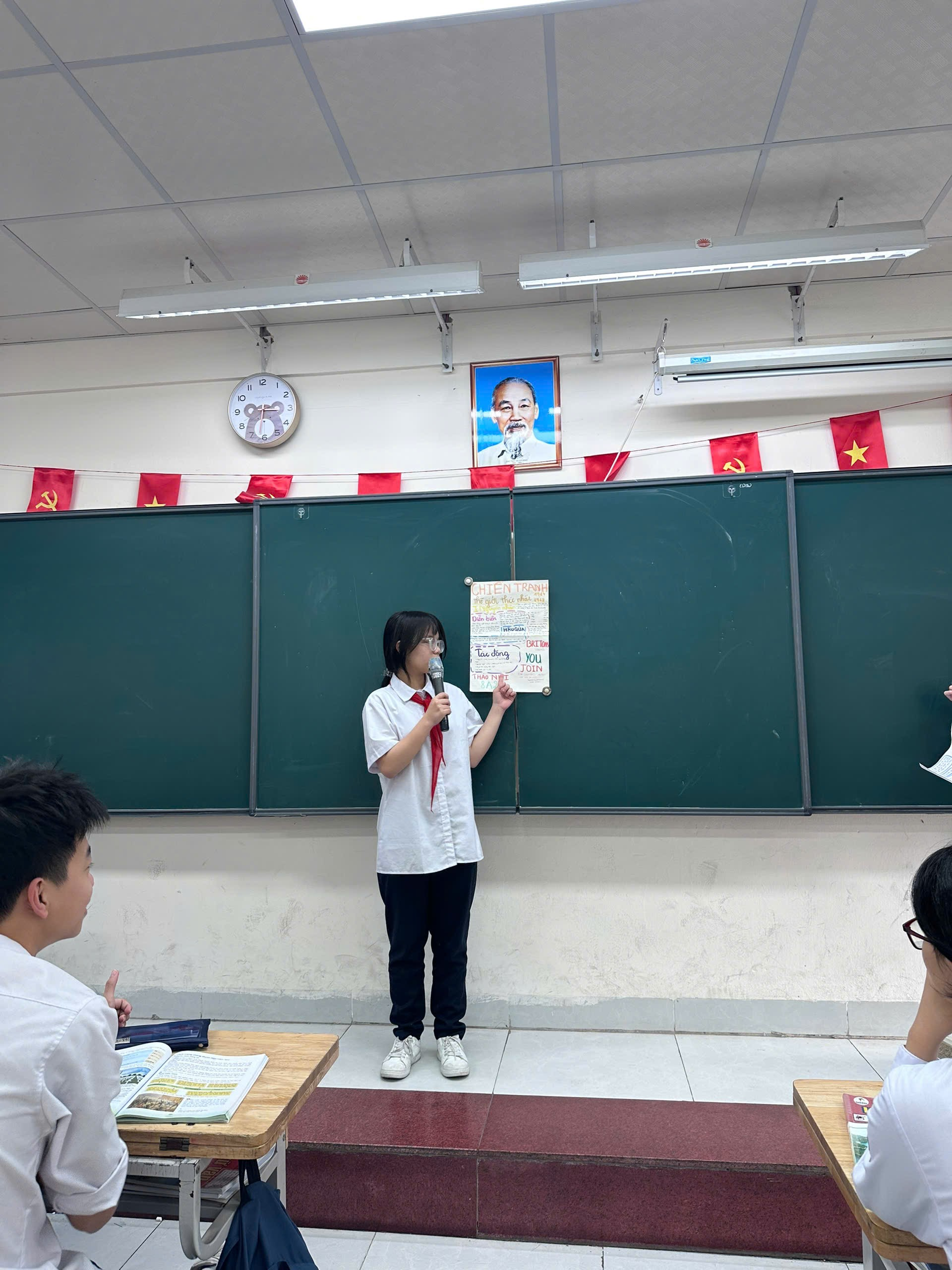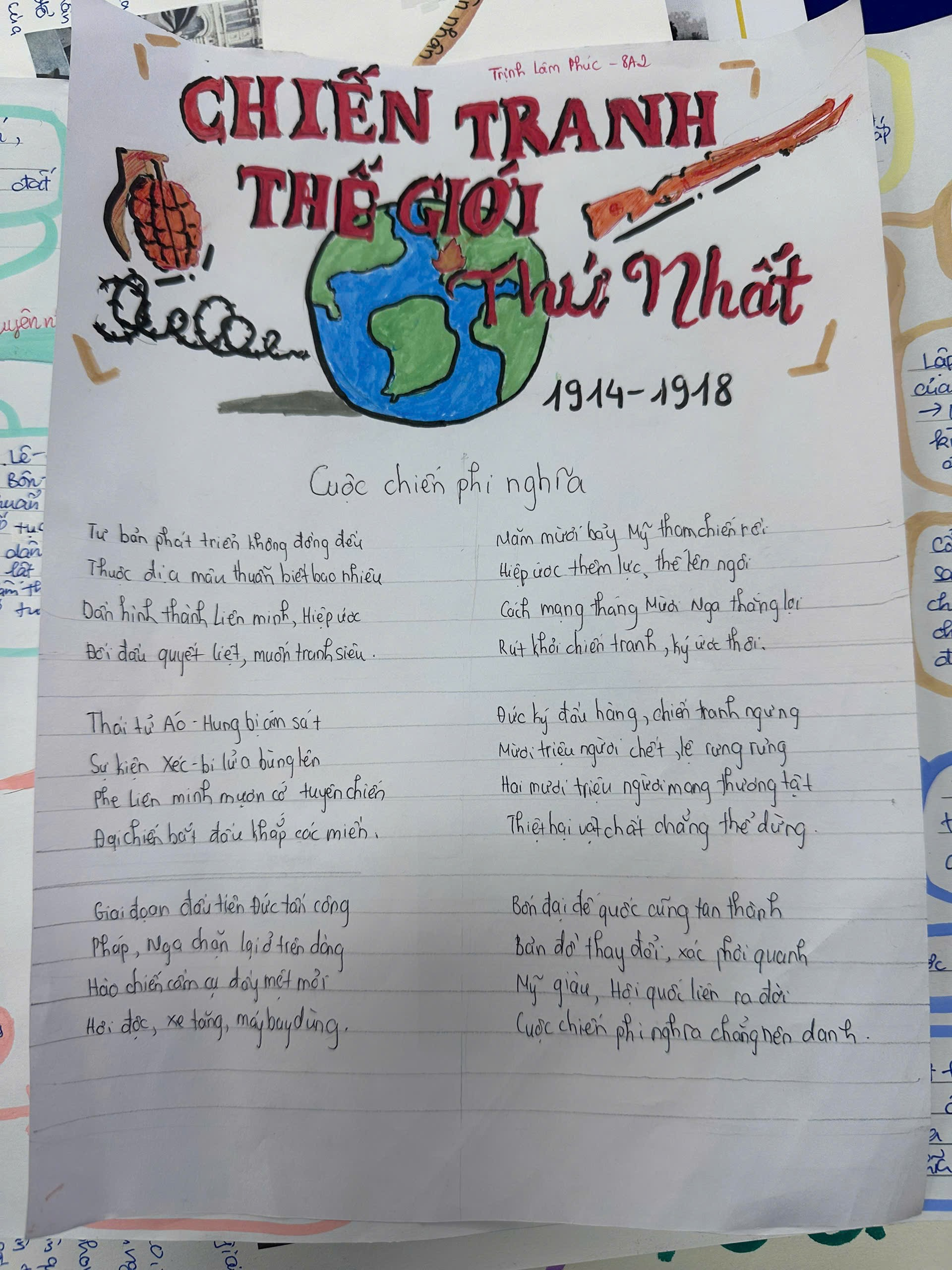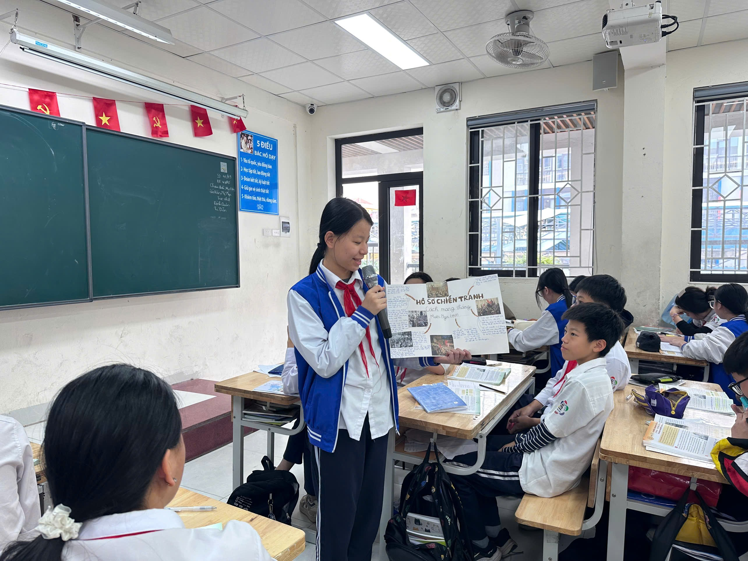 Sau khi hoàn thành sản phẩm, chúng em lần lượt lên thuyết trình trước lớp. Mỗi phần trình bày mang một màu sắc riêng, thể hiện cách nhìn và cách cảm nhận khác nhau về cùng một sự kiện lịch sử. Những câu hỏi, nhận xét và góp ý của cô giáo cùng các bạn đã giúp bài học được mở rộng, khắc sâu và trở nên sinh động hơn.