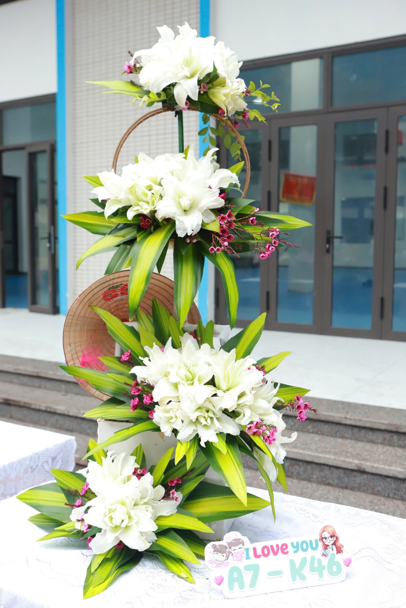 Sản phẩm của chúng em không có quá nhiều màu sắc rực rỡ bởi điểm nhấn quan trọng nhất chính là những bông ly kép trắng tinh, tượng trưng cho vẻ đẹp thuần khiết, sang trọng. Điểm xuyết là sắc hồng của những bông thanh liễu gợi đến sự trẻ trung, xinh đẹp, dịu dàng.