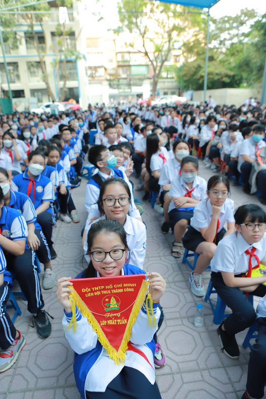 Cô Phó hiệu trưởng - Trần Thị Quỳnh Hương trao cờ thi đua cho chi đội dẫn đầu khối 6 và khối 8.
