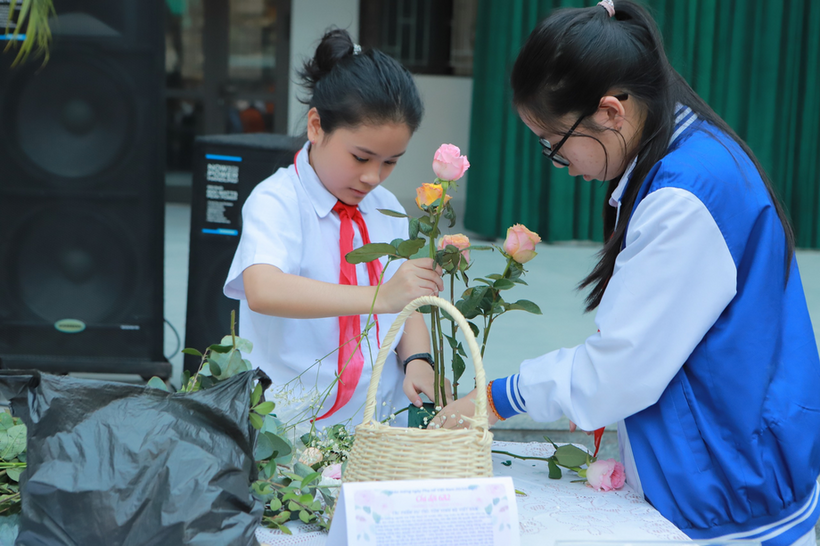 Hai bạn Nguyễn Thủy Trúc (bên trái) và Vũ Minh Khuê (bên phải) đại diện lớp tham gia Hội thi cắm hoa nghệ thuật chào mừng 20/10
