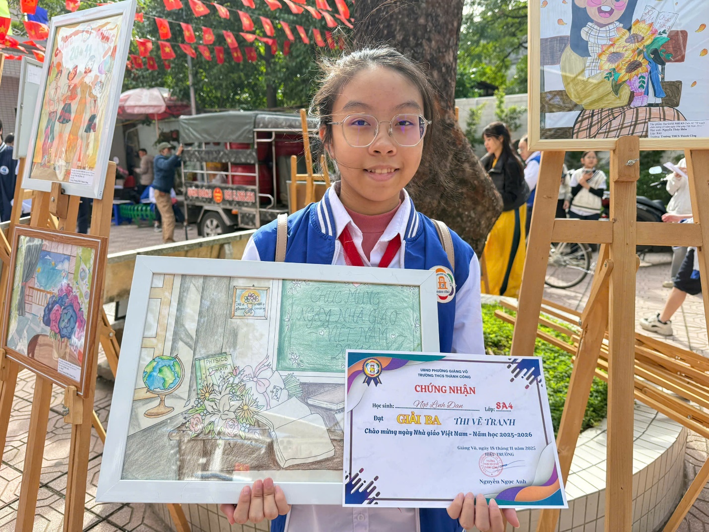 Bạn Ngô Linh Đan với bức tranh và giấy chứng nhận đạt giải Ba cuộc thi vẽ tranh cấp trường