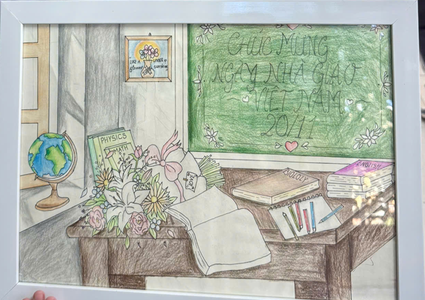 Mỗi bức tranh đều được các bạn vẽ rất tỉ mỉ, cẩn thận, nắn nót từng đường nét, lựa chọn từng sắc màu để có thể tạo nên một tác phẩm hoàn chỉnh nhất. Với những nét vẽ mềm mại, đầy cảm xúc, bạn Ngô Linh Đan đã xuất sắc đạt giải Ba trong cuộc thi vẽ tranh lần này. Các chi tiết: bảng phấn, bó hoa, khung cửa sổ, sách, bút… tất cả như hoà quyện với nhau tạo nên một khung cảnh vừa thân thuộc lại vô cùng trang nghiêm. Đặc biệt, trên góc trái bức tranh có dòng chữ “Like a flower under sunshine” - một câu nói đơn giản mà lại mang ý nghĩa sâu sắc. Câu nói ấy như ẩn dụ cho hình ảnh người giáo viên - luôn đẹp và toả sáng như những “bông hoa dưới ánh nắng mặt trời”.