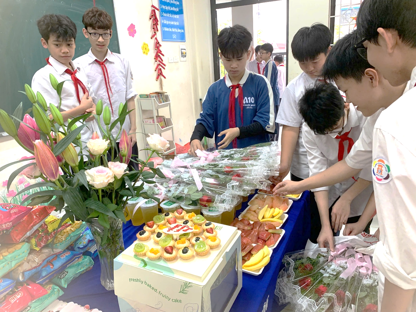 Các bạn nam sắp xếp bàn tiệc ngọt của lớp