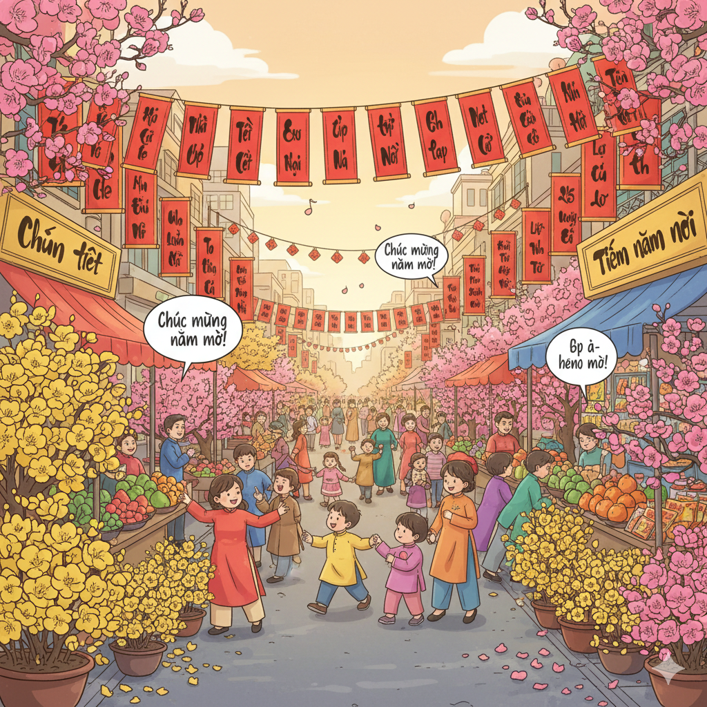 Khi những cơn gió lạnh cuối đông dần nhường chỗ cho ánh nắng dịu dàng, phố xá như khoác lên mình tấm áo mới. Hai bên đường, sắc đỏ của câu đối, sắc vàng của hoa mai, sắc hồng của đào phai hòa quyện, tạo nên bức tranh xuân sống động và ấm áp. Những gian hàng hoa rực rỡ, những sạp trái cây tràn đầy hương vị Tết, tiếng rao bán, tiếng cười nói rộn ràng… tất cả làm nên nhịp điệu sôi động của mùa xuân giữa lòng thành phố.