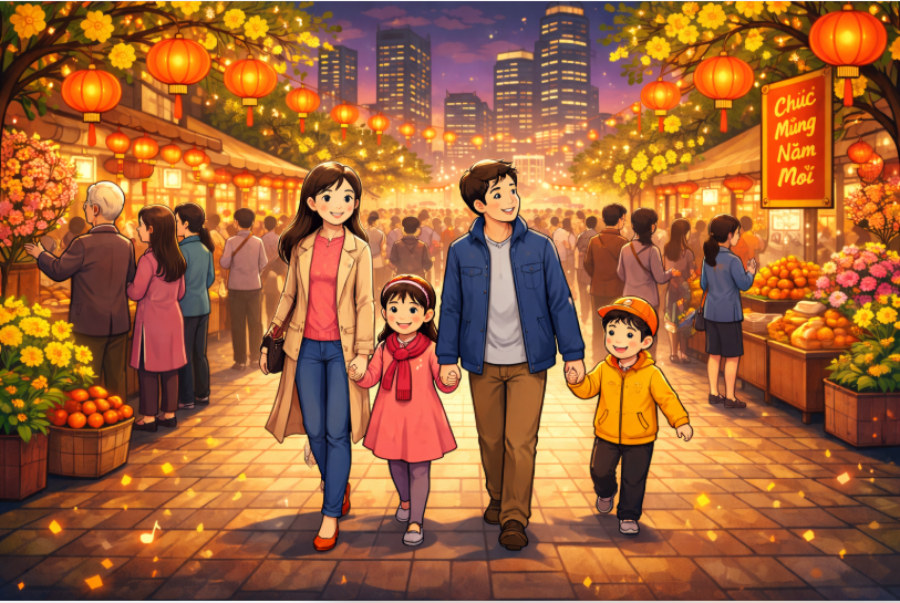 Đặc biệt, sắc xuân nơi phố thị còn hiện lên qua những khoảnh khắc sum vầy. Dưới ánh đèn lung linh, các gia đình quây quần bên mâm cơm tất niên, trao nhau những lời chúc tốt đẹp. Dù cuộc sống thành phố có bộn bề, vội vã đến đâu, thì mùa xuân vẫn là khoảng lặng để con người trở về với yêu thương, với mái ấm và những giá trị thiêng liêng của gia đình.