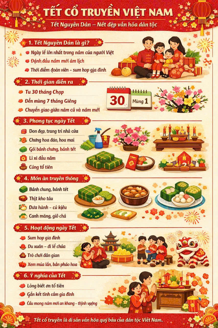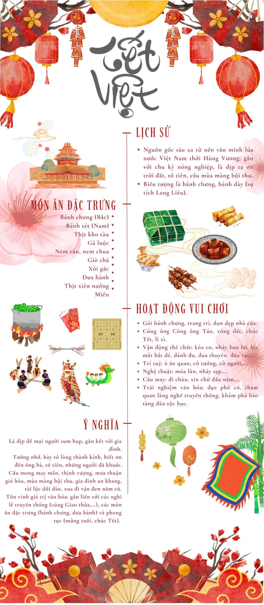 Các nhóm học sinh đã lựa chọn nhiều nội dung quen thuộc gắn với ngày Tết cổ truyền như nguồn gốc Tết Nguyên Đán, ý nghĩa của các phong tục truyền thống, những món ăn ngày Tết, trang phục và các hoạt động sinh hoạt trong dịp đầu xuân. Mỗi infographic là một sản phẩm thể hiện sự tìm tòi, sáng tạo và cách nhìn riêng của từng nhóm học sinh.