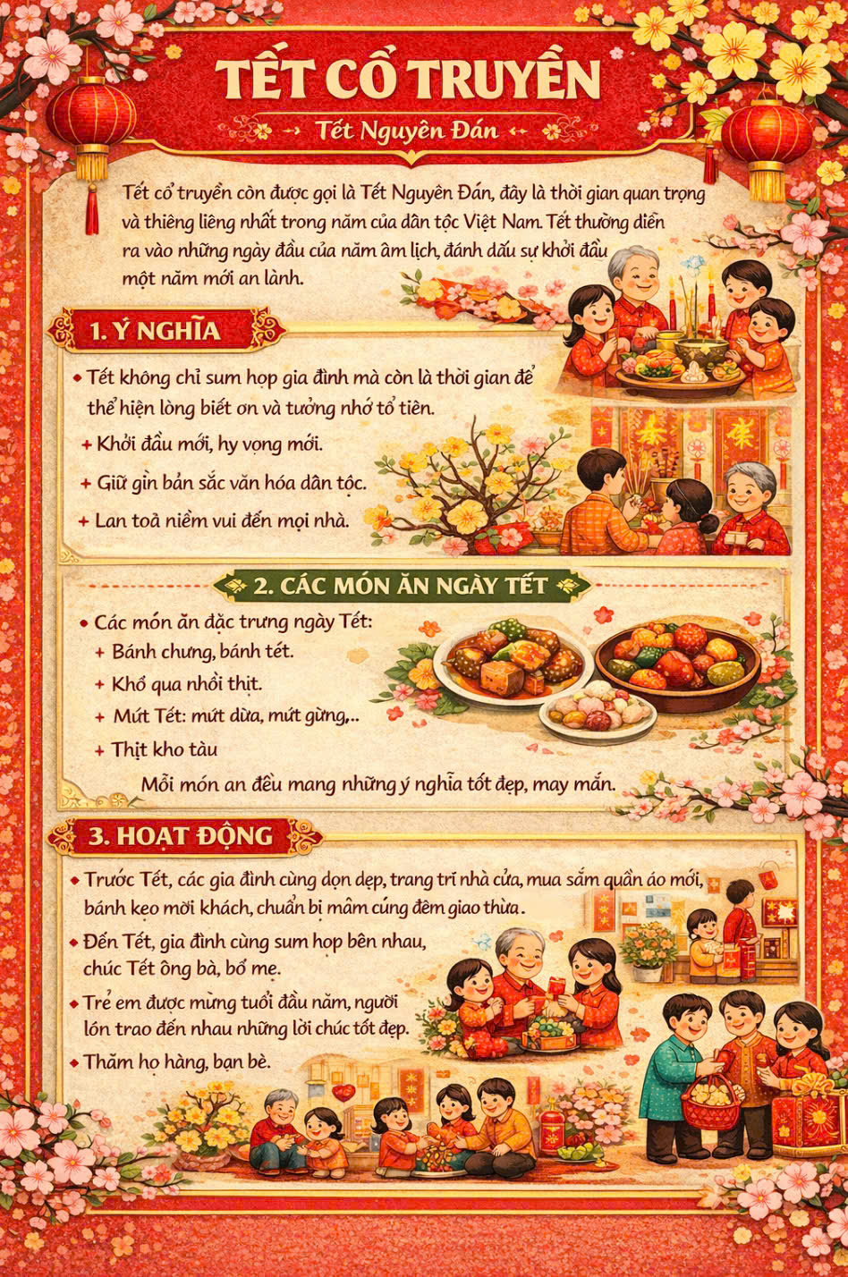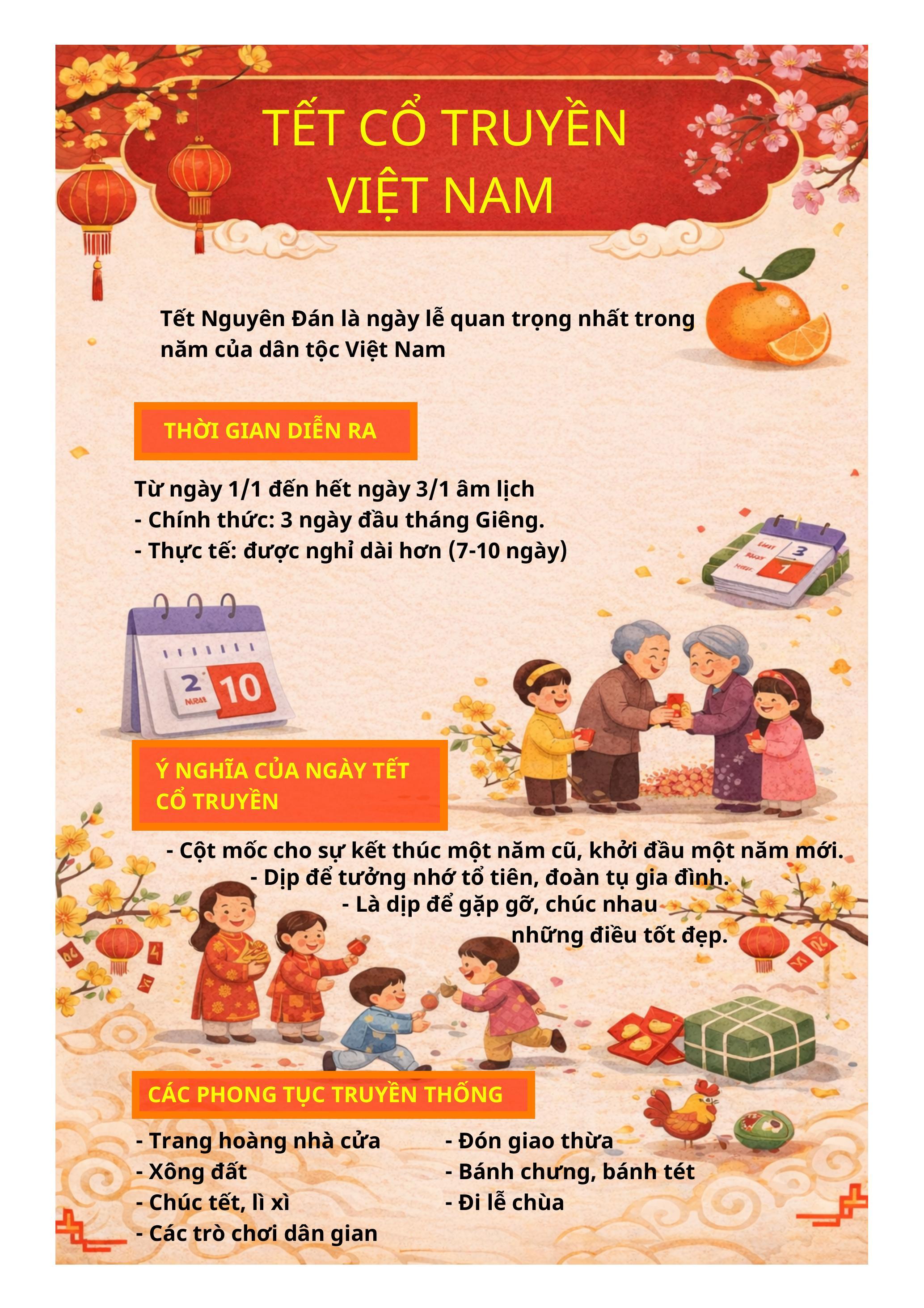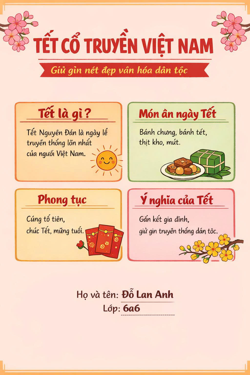 Thông qua hoạt động này, chúng em không chỉ được ôn lại kiến thức Ngữ văn về văn hóa dân gian, phong tục truyền thống mà còn rèn luyện kỹ năng làm việc nhóm, kỹ năng trình bày thông tin và sử dụng công cụ thiết kế. Việc học tập trở nên sinh động hơn khi học sinh được trực tiếp tạo ra sản phẩm học tập của riêng mình.