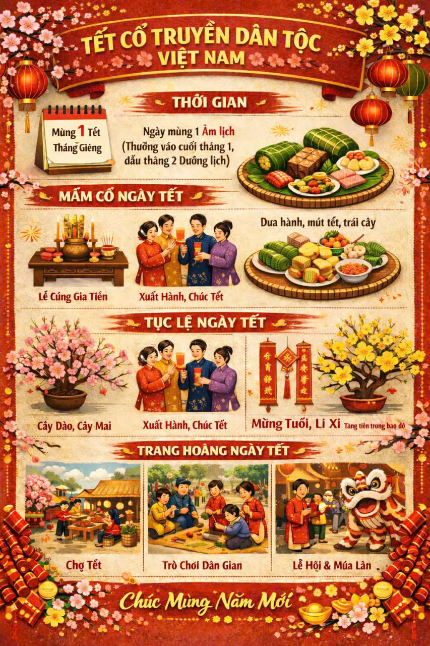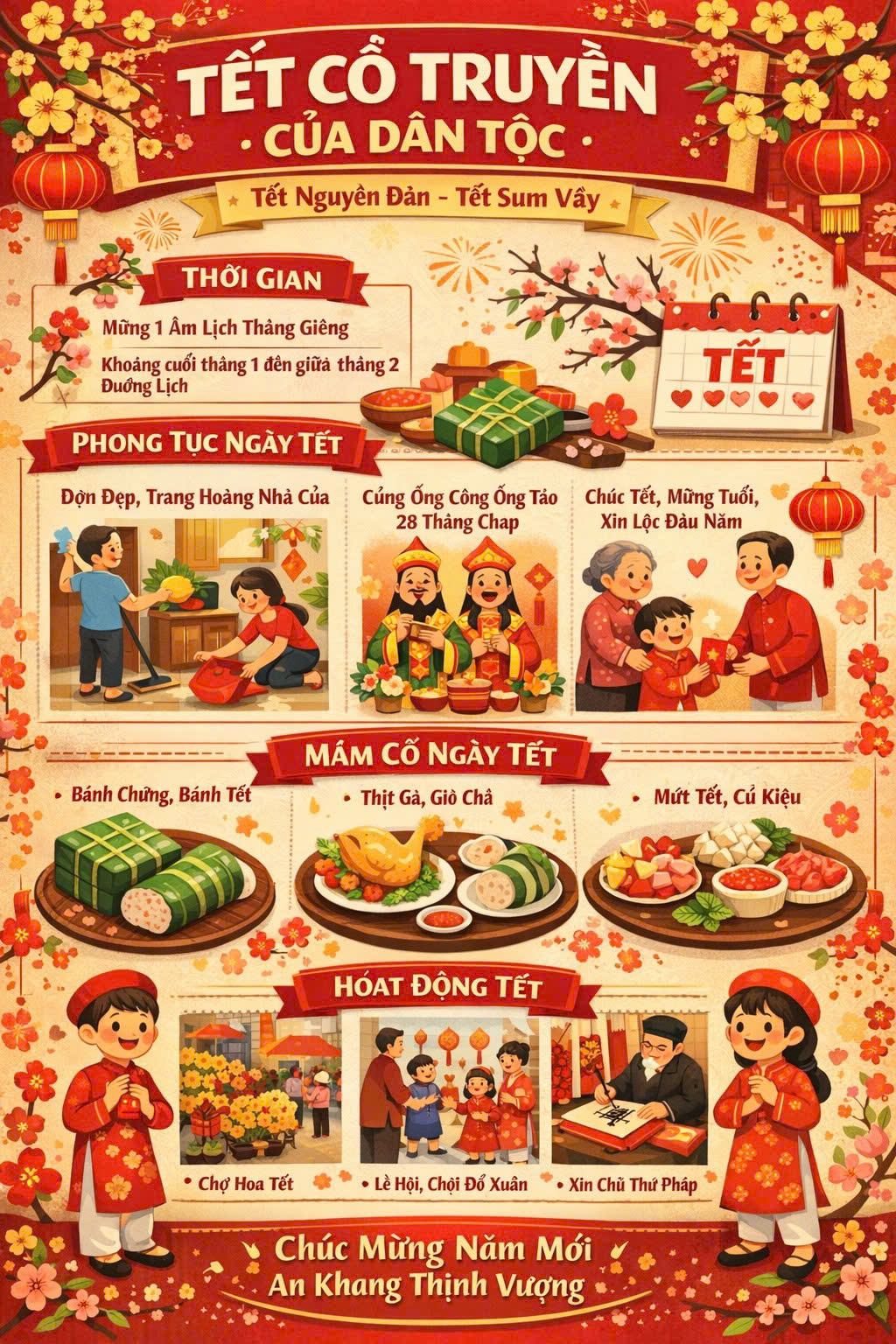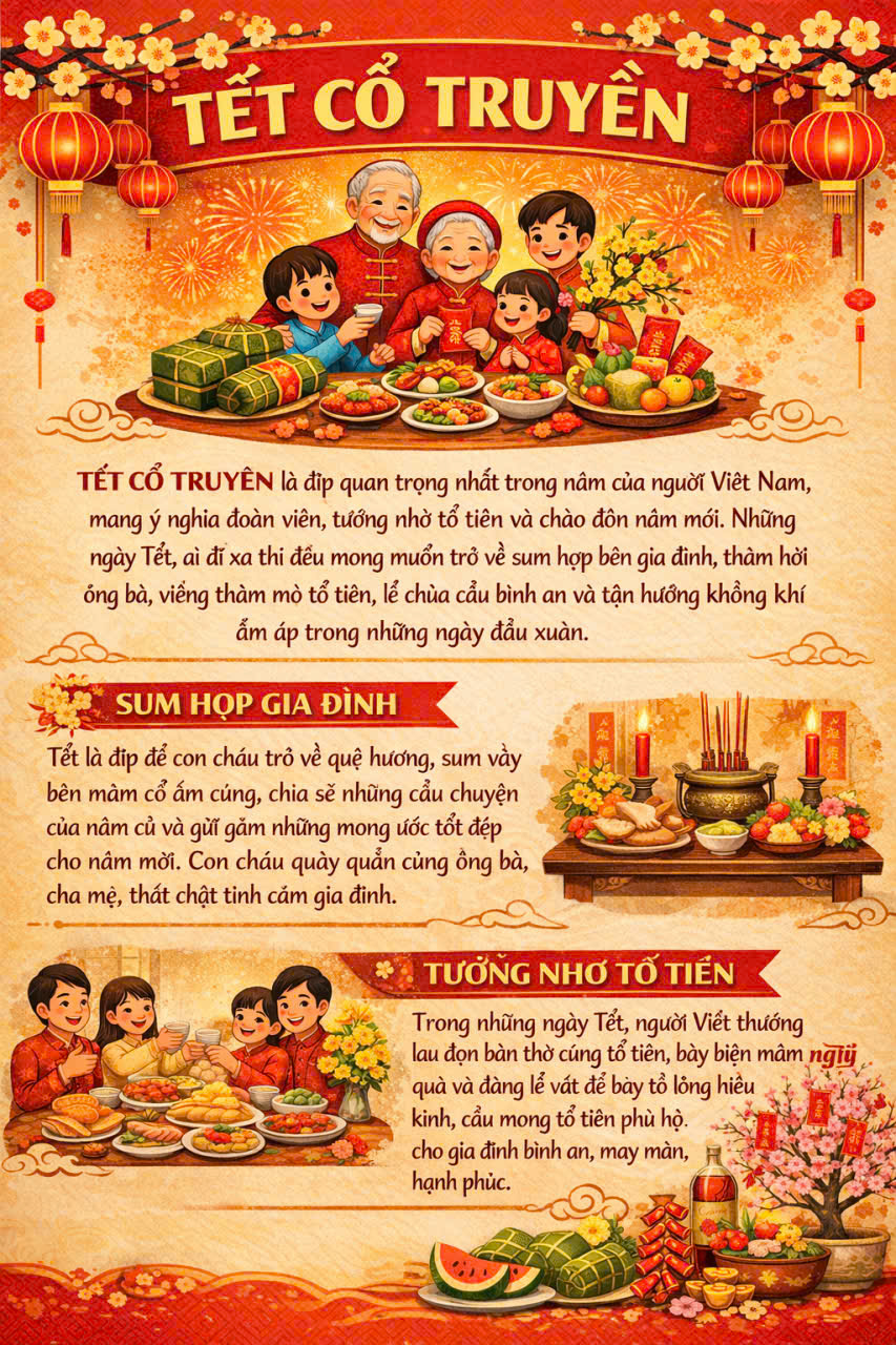 Thông qua hoạt động này, chúng em không chỉ được ôn lại kiến thức Ngữ văn về văn hóa dân gian, phong tục truyền thống mà còn rèn luyện kỹ năng làm việc nhóm, kỹ năng trình bày thông tin và sử dụng công cụ thiết kế. Việc học tập trở nên sinh động hơn khi học sinh được trực tiếp tạo ra sản phẩm học tập của riêng mình.