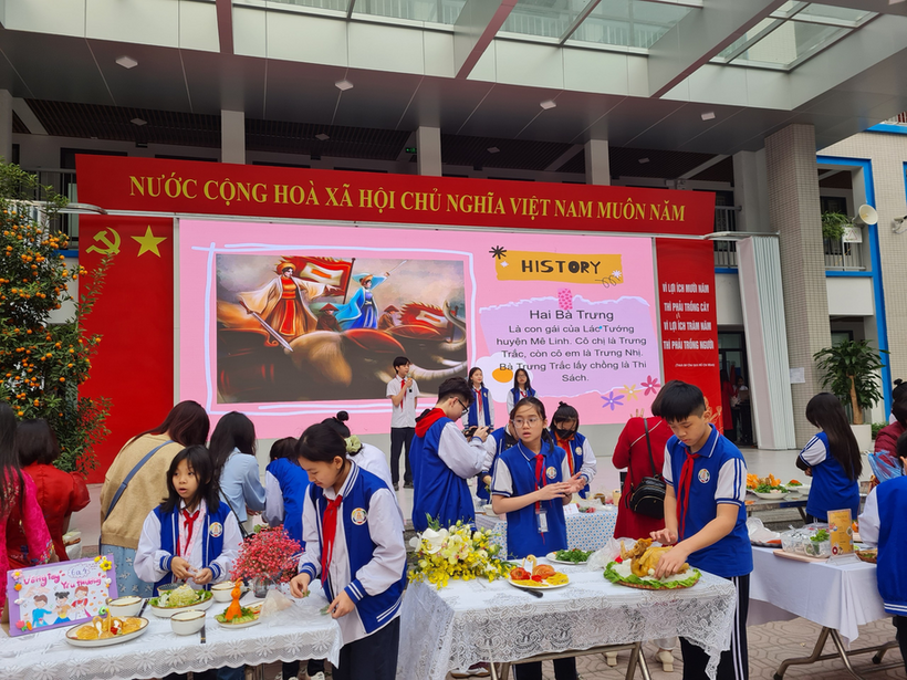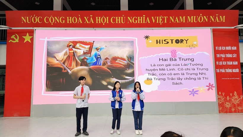 Các bạn học sinh điểu khiển chương trình tìm hiểu về lịch sử liên quan đến 8/3
