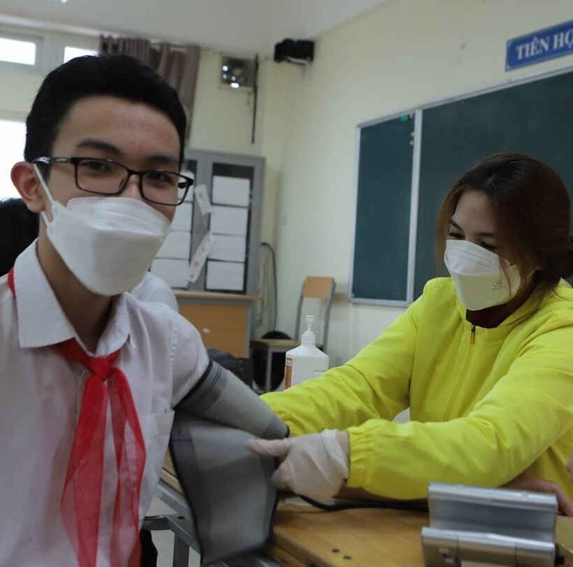 Cô Kim Ngân – Cán bộ y tế của nhà trường tham gia khám sàng lọc trước tiêm cho học sinh.