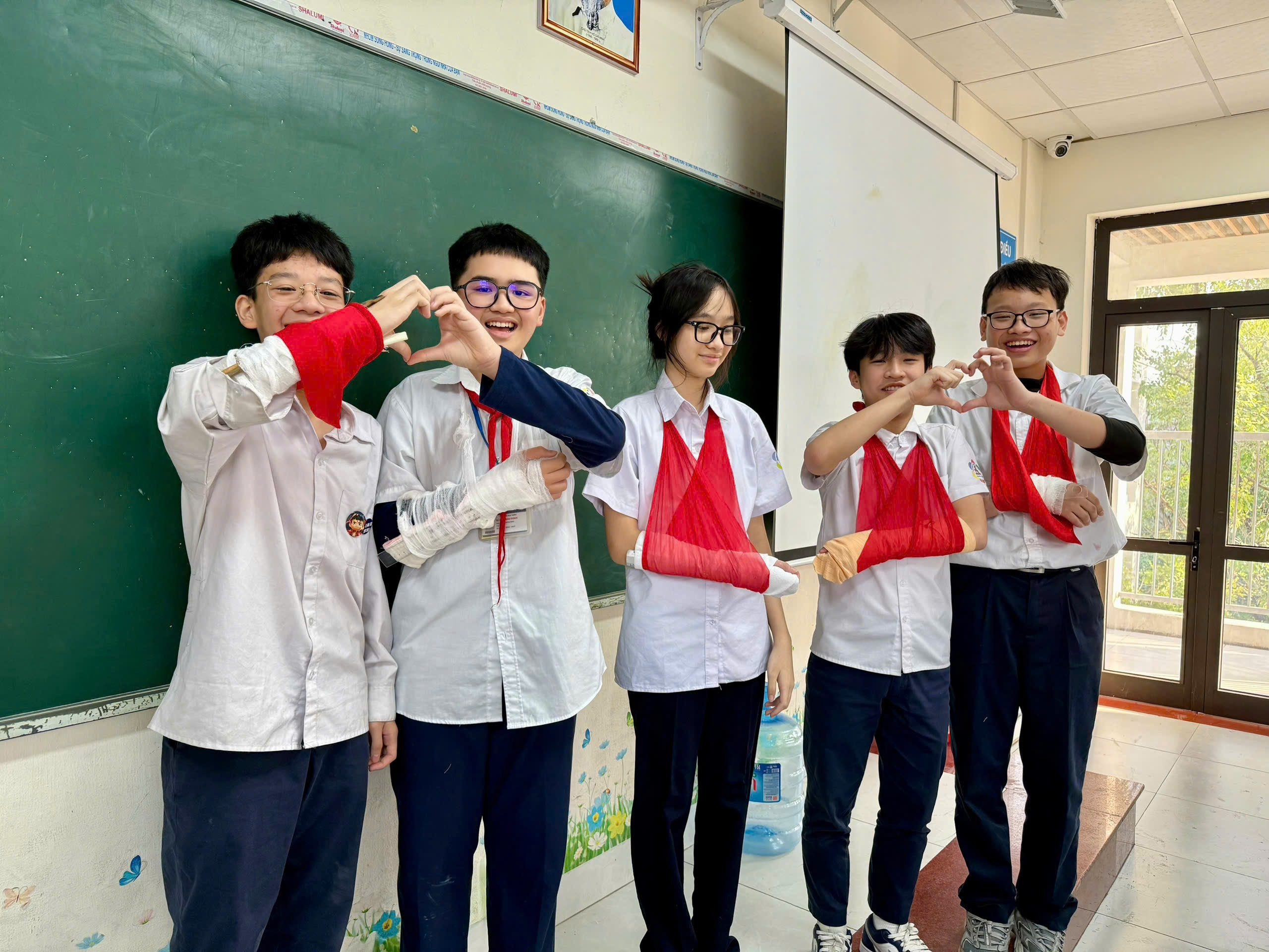 Các bạn học sinh tham gia rất hào hứng, sáng tạo và vui vẻ. Những “cánh tay băng bó” trong lớp không phải vì chấn thương thật mà là kết quả của cả một buổi rèn luyện chăm chỉ và đầy tinh thần đồng đội. Nhiều bạn còn tạo hình trái tim để thể hiện sự gắn kết và tinh thần “vì bạn bè, vì cộng đồng”.