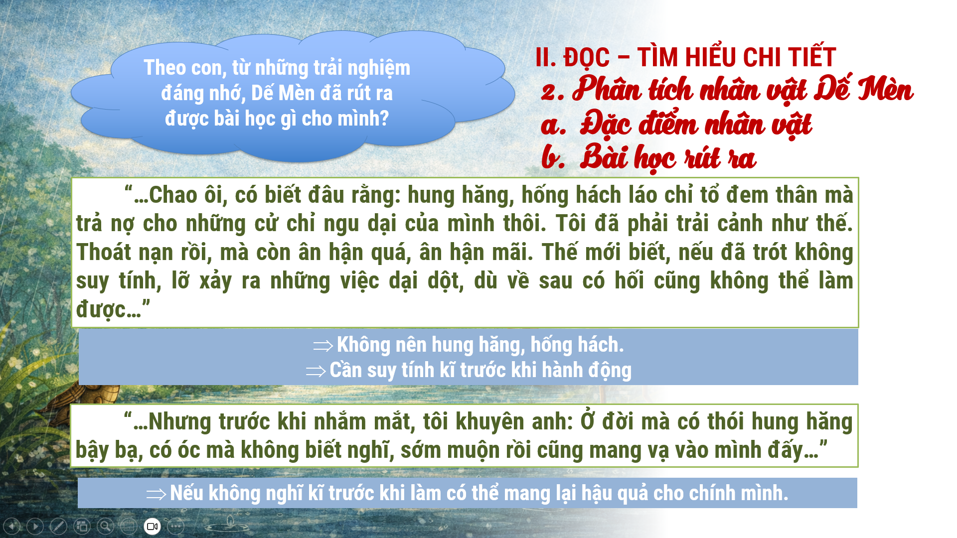 Dưới sự hướng dẫn của cô giáo, chúng em cùng tìm hiểu về tính cách của Dế Mèn trước và sau khi gây ra cái chết thương tâm cho Dế Choắt. Nhiều bạn đã tích cực phát biểu ý kiến, nêu cảm nhận của mình về sự thay đổi trong suy nghĩ của Dế Mèn sau sự việc ấy.