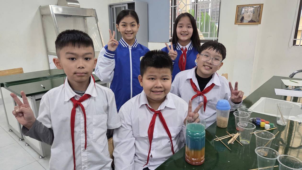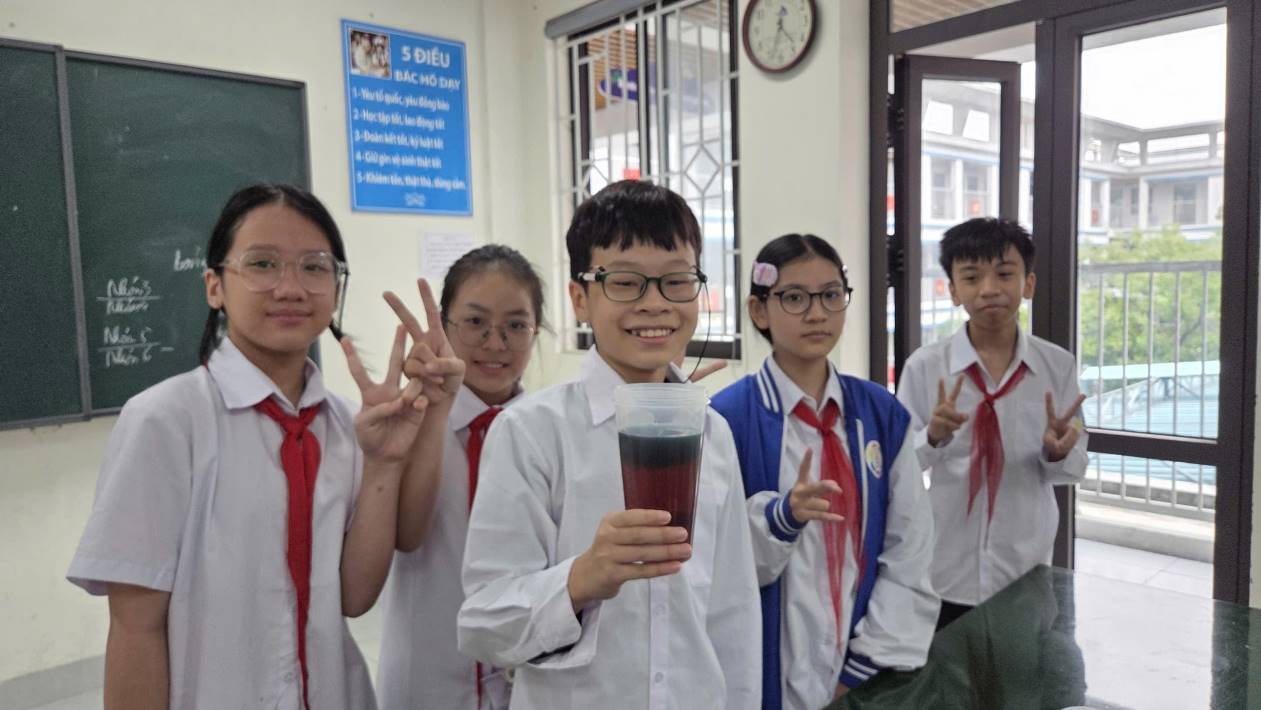 Dưới sự hướng dẫn tỉ mỉ của cô, từng nhóm lần lượt nhỏ từng lớp chất lỏng vào cốc theo đúng thứ tự khối lượng riêng. Bạn nào cũng làm việc nghiêm túc, nhưng không khí thì vẫn rộn ràng vì mỗi bước thí nghiệm đều khiến chúng em căng thẳng xen lẫn hồi hộp: lớp tiếp theo có “chìm” xuống đúng vị trí không, hay lại “ẵm nhau” hòa lẫn thành một màu không tên?