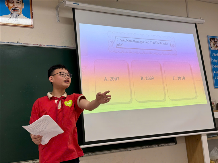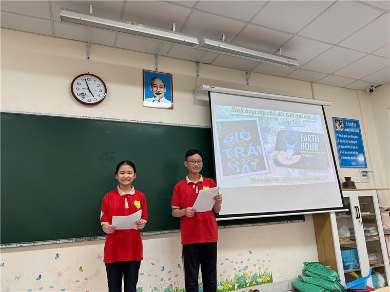 Buổi thuyết trình được các bạn cán bộ lớp chuẩn bị kỹ lưỡng và diễn ra trong không khí ấm cúng, sôi nổi tại chính lớp học của chúng em. Dưới sự hướng dẫn tận tình của cô giáo chủ nhiệm, chúng em đã cùng nhau tìm hiểu, thảo luận và chia sẻ về ý nghĩa to lớn của chiến dịch Giờ Trái Đất - một hoạt động có quy mô toàn cầu nhằm nâng cao ý thức cộng đồng về biến đổi khí hậu, tiết kiệm năng lượng và bảo vệ môi trường sống.
