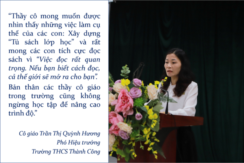 Buổi lễ diễn ra trang trọng với sự tham dự của Ban Giám hiệu, các thầy cô giáo và các con học sinh trường THCS Thành Công. Trong lời phát động, cô giáo Phó Hiệu trưởng Trần Thị Quỳnh Hương đã dặn dò học sinh về giá trị của việc tự học, đọc sách, chỉ đạo những việc làm thiết thực và tin tưởng sự nỗ lực của giáo viên và học sinh nhà trường không ngừng học tập chuyên cần, tự giác, hiệu quả.