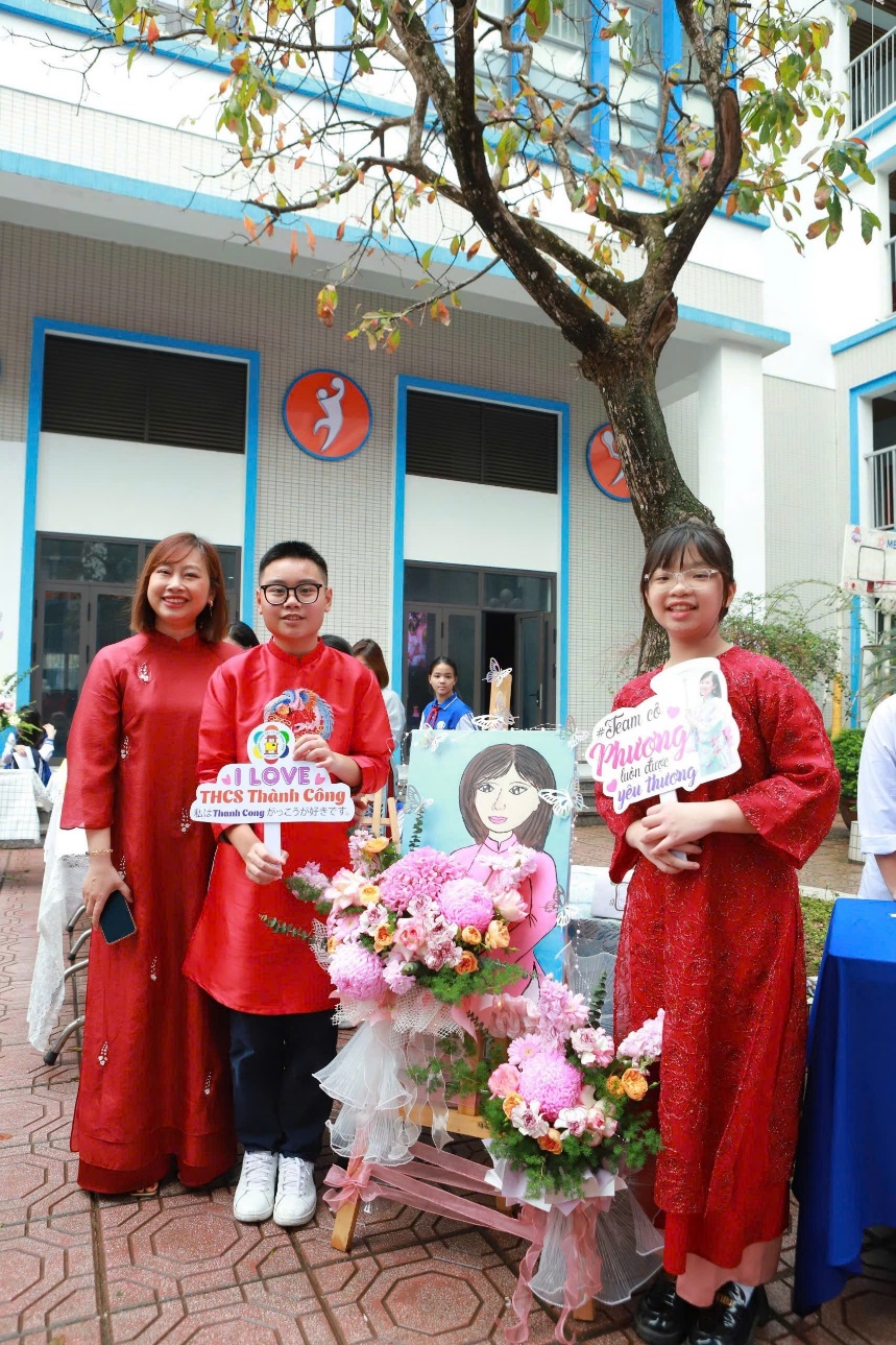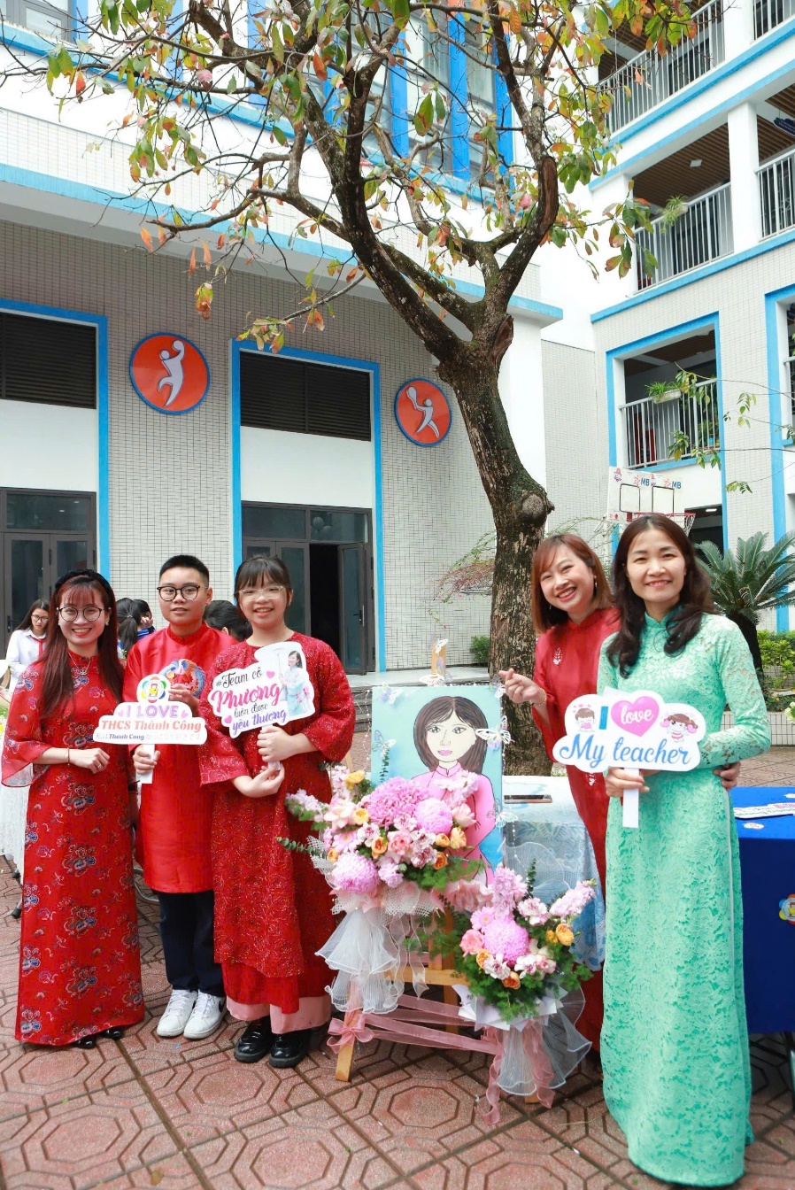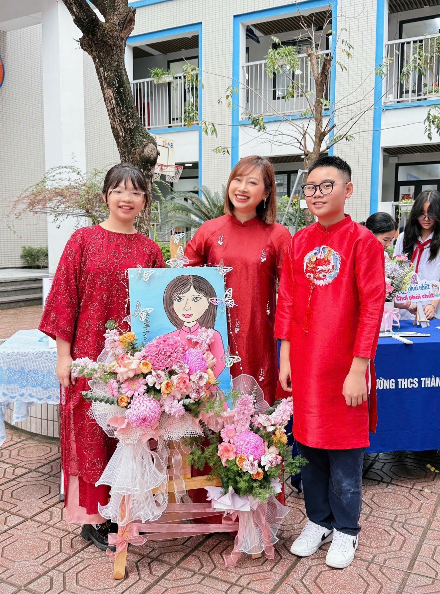 Nụ cười rạng rỡ của cô và trò trước tác phẩm của 6A3