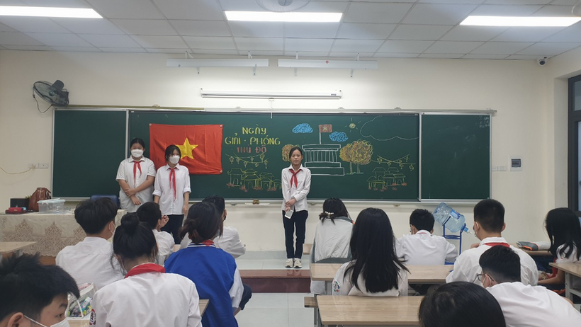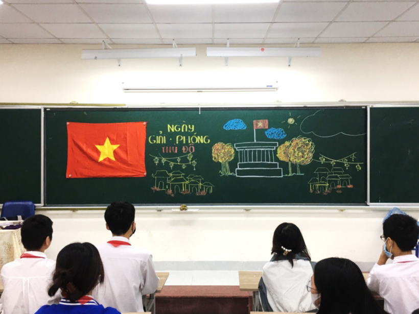 Sau khi nghe phát thanh, cả lớp cùng nghe nhắc nhở thi đua của cô giáo chủ nhiệm và cùng ôn lại về diễn biến lịch sử về ngày 10-10.