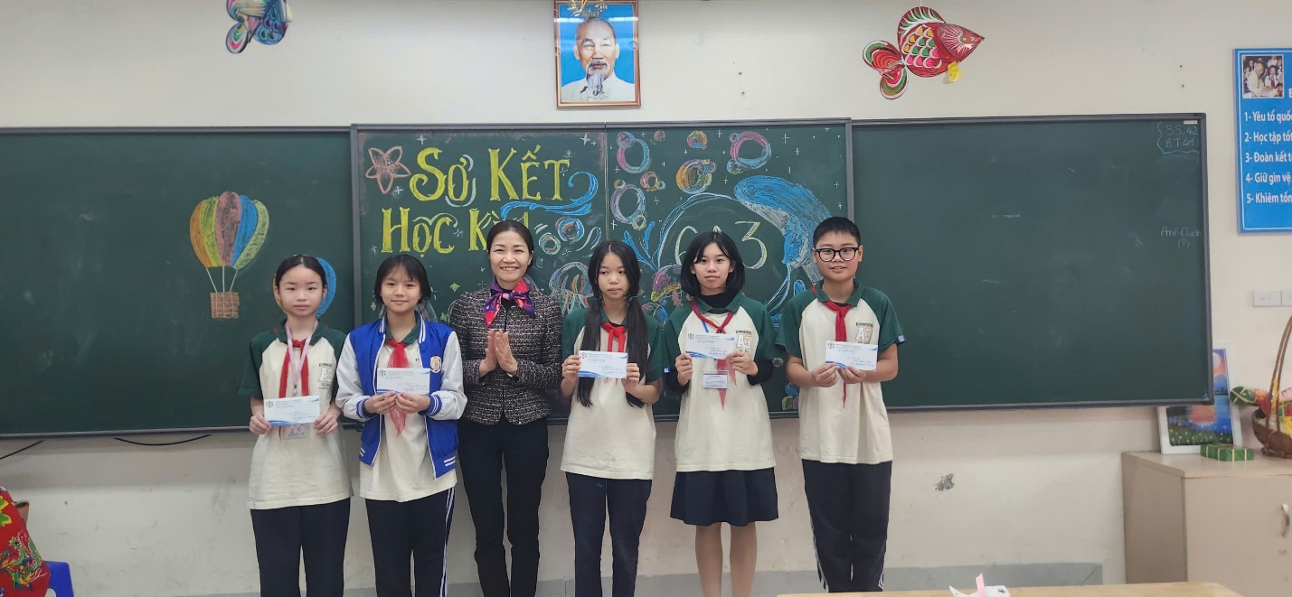 Cô Trần Thị Quỳnh Hương tặng học bổng cho các bạn 6A3 đạt học sinh giỏi môn Ngữ văn.
