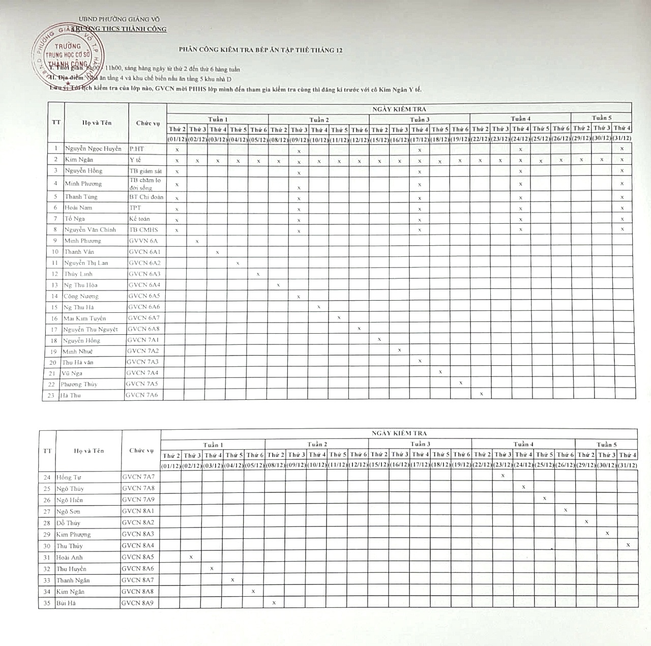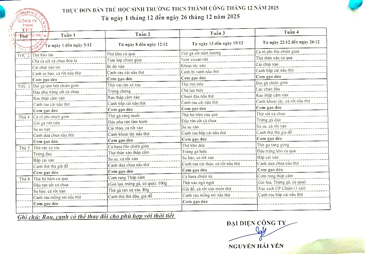 TB: Thực đơn bán trú của học sinh trường THCS Thành Công - THÁNG 12