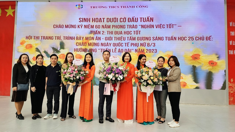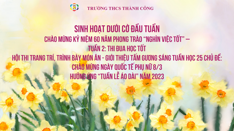 Sáng ngày thứ hai, 6/3/2023 trường THCS Thành Công tổ chức sinh hoạt dưới cờ đầu tuần với chuỗi hoạt động: chào mừng kỷ niệm 60 năm phong trào “Nghìn việc tốt”; Thi đua học tốt; Hội thi trang trí, trình bày món ăn chào mừng ngày Quốc tế phụ nữ 8/3 và hưởng ứng “Tuần lễ áo dài Việt Nam” năm 2023.