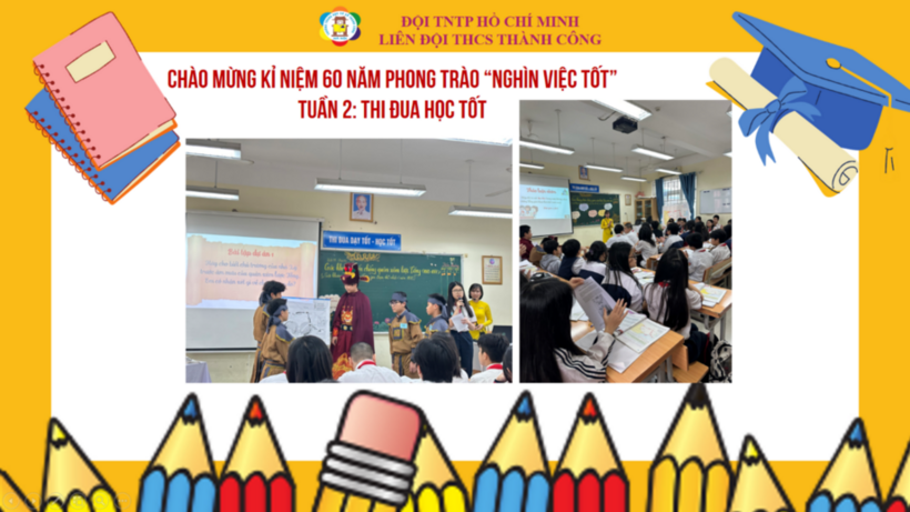Bên cạnh phát động chủ đề tuần 2 - Liên đội tổ chức hoạt động trang trí và trình bày món ăn giữa các lớp khối 6,7,8 đồng thời kết hợp triển khai hoạt động “Mỗi tuần một câu chuyện đẹp, một tấm gương sáng, một cuốn sách hay” dưới sự thể hiện của 2 tập thể lớp 8A6 – 6A2, các con học sinh đã sáng tạo nội dung giới thiệu về 2 tấm gương sáng: Hai Bà Trưng và Marie Curie.