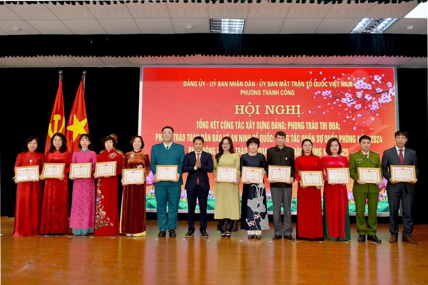 Hội nghị đã tổng kết những kết quả đạt được của Đảng bộ - chính quyền và nhân dân phường Thành Công với nỗ lực phấn đấu, thực hiện tốt các nhiệm vụ với nhiều kết quả nổi bật đáng ghi nhận trong công tác tham mưu, tổ chức thực hiện phong trào năm 2024. Hội nghị tuyên dương khen thưởng, vinh danh các Tập thể, cá nhân Hoàn thành xuất sắc nhiệm vụ năm 2024.