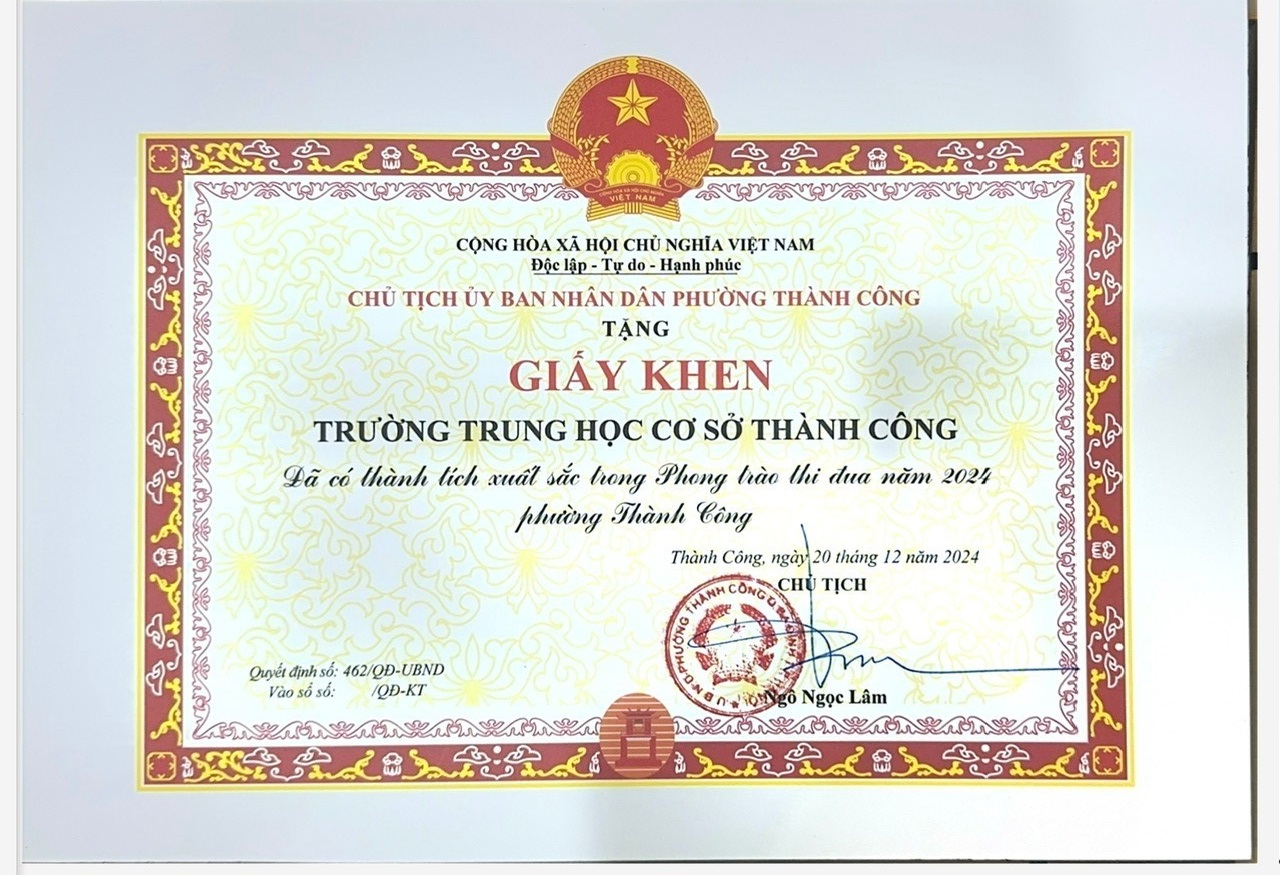 Sáng ngày 26/12/2024, Đảng ủy - UBND – UBMTTQ Việt Nam phường Thành Công tổ chức Hội nghị Tổng kết công tác xây dựng Đảng; Phong trào thi đua; phong trào toàn dân bảo vệ an ninh Tổ quốc; công tác quân sự quốc phòng năm 2024 và phát động thi đua năm 2025. Chi bộ trường THCS Thành Công vinh dự được biểu dương khen thưởng là Chi bộ hoàn thành xuất sắc nhiệm vụ năm 2024.