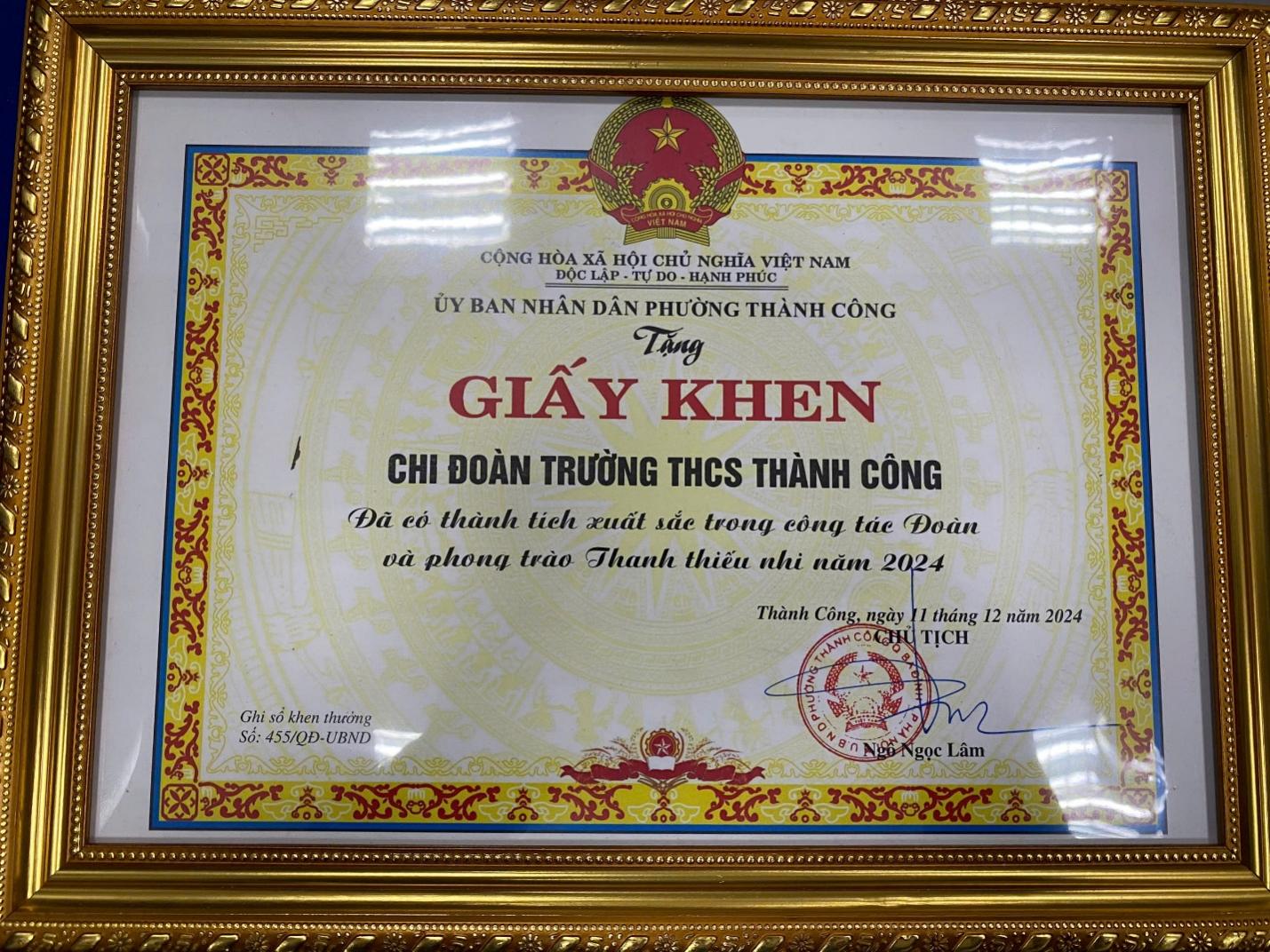 Ngày 23/12/2024, trong “Hội nghị tổng kết công tác Đoàn - Đội và phong trào thanh thiếu nhi năm 2024, triển khai phương hướng, nhiệm vụ công tác năm 2025” Chi đoàn trường THCS Thành Công được UBND phường Thành Công trao tặng giấy khen vì có thành tích xuất sắc trong công tác Đoàn và phong trào Thanh thiếu nhi năm 2024.