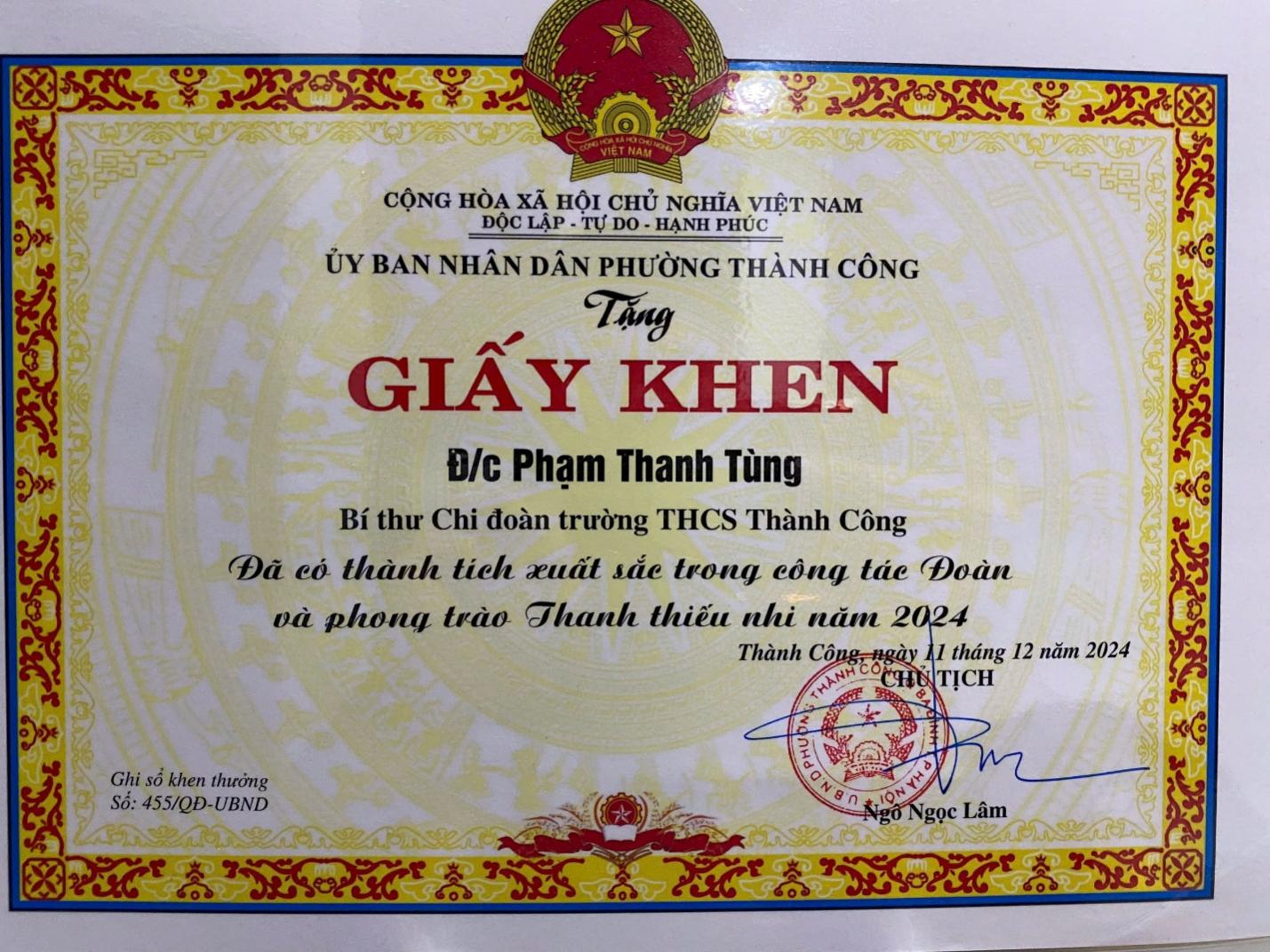 Cũng tại Hội nghị Tổng kết hôm nay, đồng chí Phạm Thanh Tùng – Bí thư Chi đoàn trường THCS Thành Công cũng vinh dự được trao tặng giấy khen cá nhân vì những thành tích xuất sắc trong công tác Đoàn và phong trào thanh thiếu nhi năm 2024. Đây là năm thứ tư liên tiếp đồng chí Tùng được nhận vinh dự này.