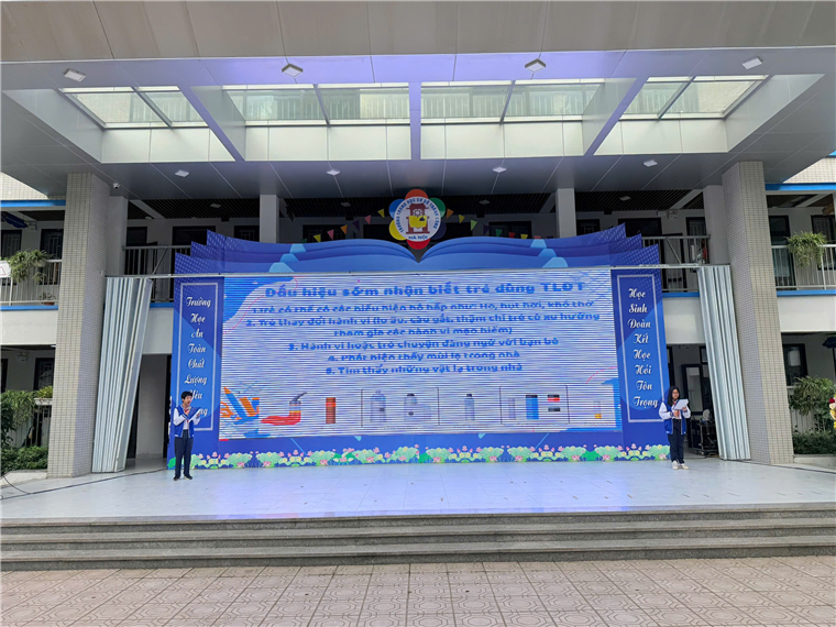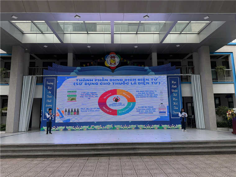 Mở đầu chương trình, các bạn MC đã dẫn dắt buổi sinh hoạt một cách duyên dáng và tự tin, nêu rõ thực trạng đáng báo động của việc sử dụng thuốc lá điện tử trong giới trẻ hiện nay. Các em nhấn mạnh sự cần thiết của việc trang bị kiến thức và nâng cao ý thức phòng tránh cho học sinh trước những cám dỗ từ thuốc lá điện tử.