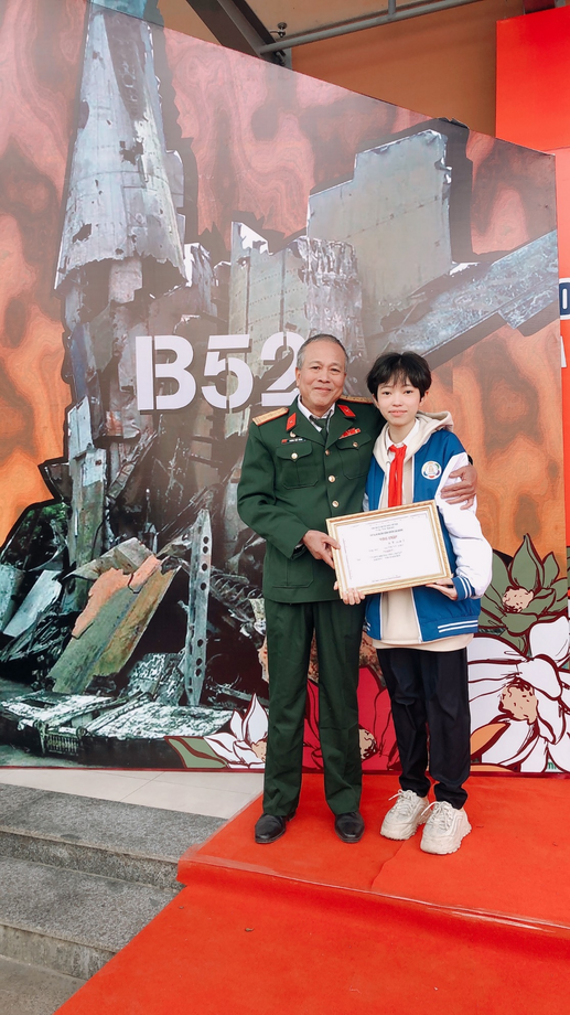 Con Đinh Khánh Hà chụp hình lưu niệm tại triển lãm 50 năm chiến thắng “Hà Nội – Điện Biên Phủ trên không”
