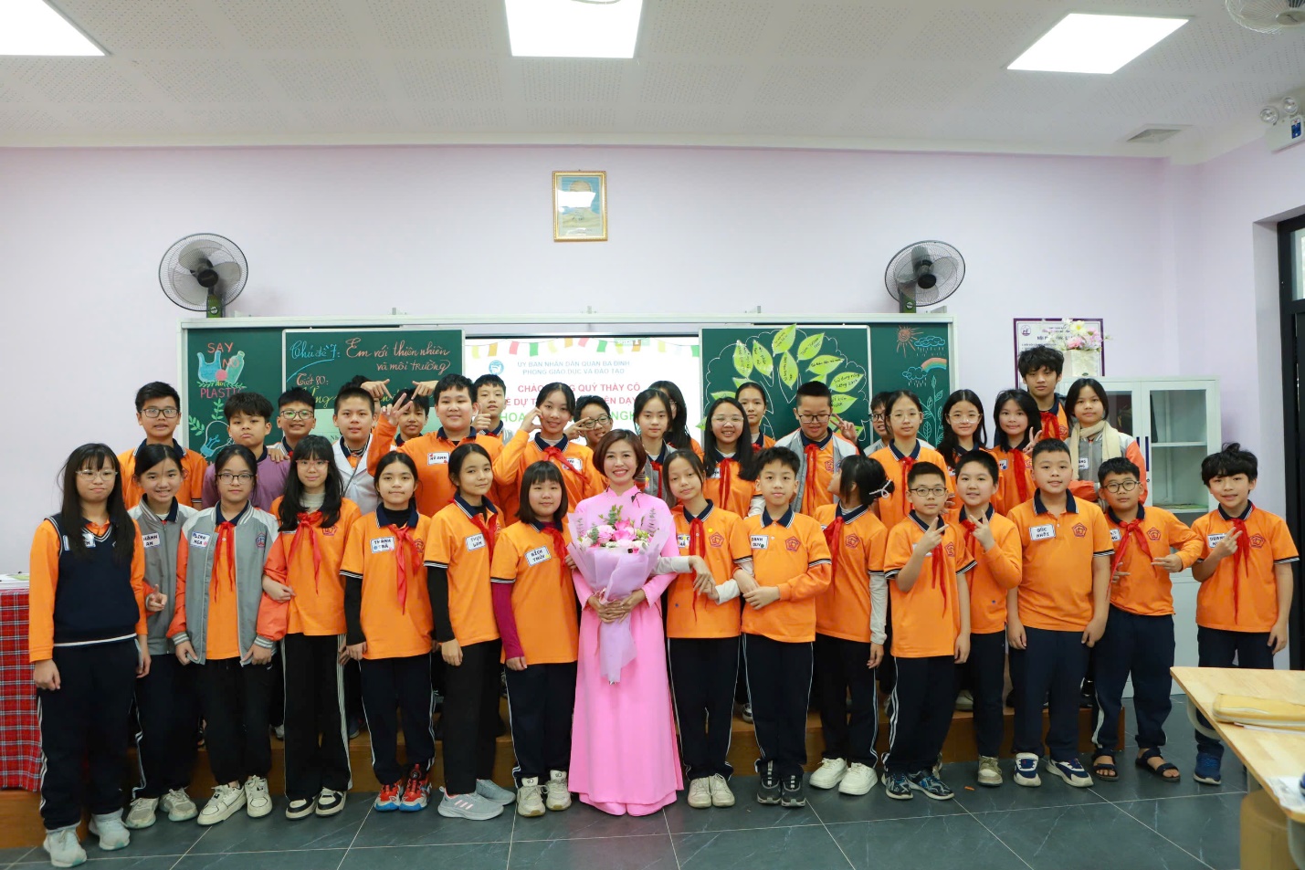 Cô Hồng chụp hình lưu niệm với học sinh 6A4 THCS Nguyễn Trãi