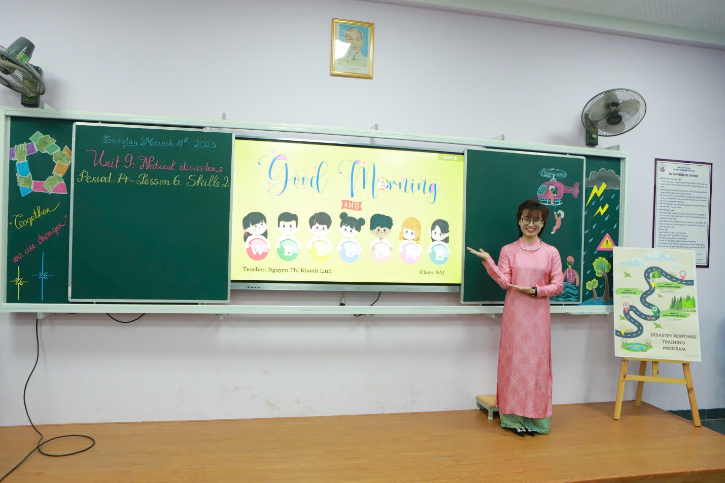 Cô Nguyễn Thị Khánh Linh tham dự hội thi với tiết dạy môn Tiếng Anh về thảm hoạ thiên nhiên - kĩ năng Nghe và Viết (unit 9: Natural disasters, skills 2: Listening & Writing). Tiết học kĩ năng nghe và viết được thiết kế trong bối cảnh thực tế một tiết học kĩ năng sống. Bối cảnh: trung tâm ứng phó thiên tai bão lũ. Các hoạt động ứng phó thiên tai trước - trong và sau bão, lũ. Đặc biệt trong tiết dạy, cô Khánh Linh đã khéo léo sử dụng công nghệ AI để tăng thêm tính sinh động và trực quan hình ảnh. Các hoạt động trong giờ cũng được thiết kế rất sinh động và tạo cảm hứng học tập cho học sinh.