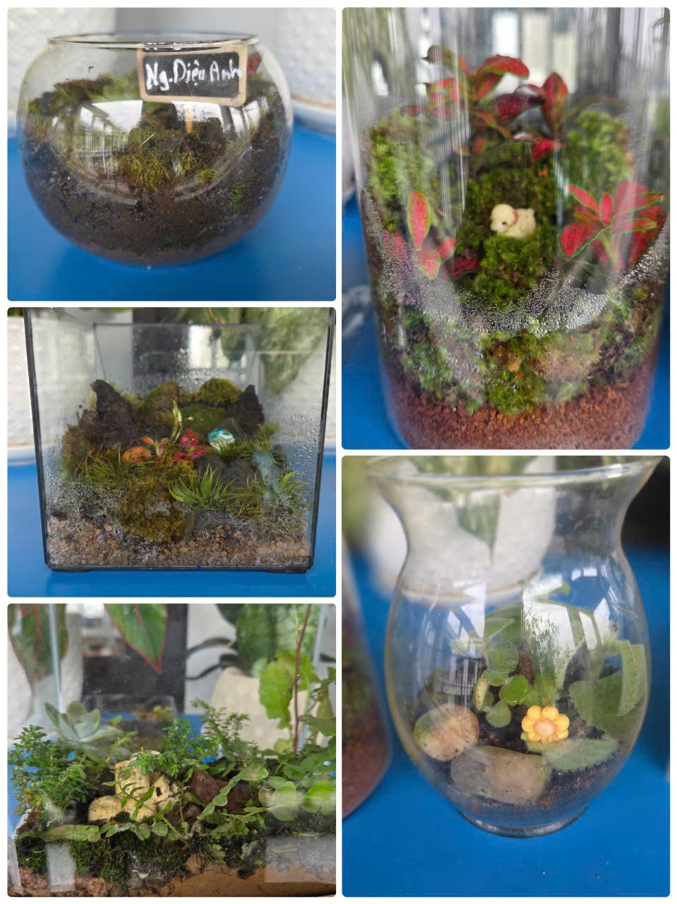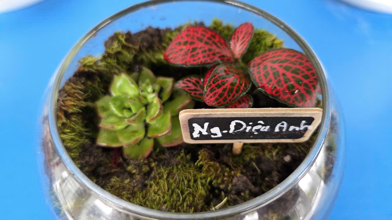 Những ánh mắt chăm chú, những bàn tay nâng niu từng nhánh rêu, từng lớp đất… tất cả đã tạo nên một không khí vừa say mê, vừa ấm áp. Từ những chiếc lọ thủy tinh đơn giản, 6A đã “thổi hồn” để biến chúng thành những tác phẩm nghệ thuật sống động.