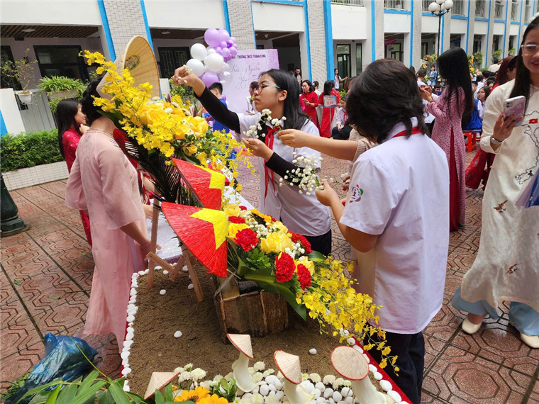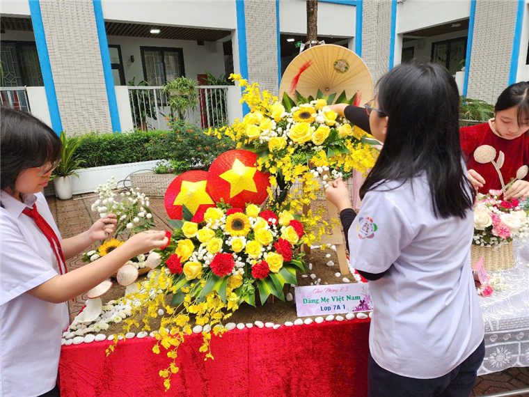 Trong tiết chào cờ đầu tuần, nhà trường đã tổ chức hội thi cắm hoa nghệ thuật chào mừng ngày 8/3. Trong không gian rực rỡ sắc hoa, quyện hòa sắc thắm, hương thơm của từng bó hoa hồng, hoa hướng dương, hoa tuy-líp được mỗi lớp chuẩn bị sẵn bay theo làn gió xuân nhè nhẹ, phảng phất hương thơm tới từng ngõ ngách trong trường. Sự kiện này diễn ra đã thu hút hơn 30 lớp, từ các em khối 6, đến các bạn khối 7, các anh chị khối 8, khối 9,... cùng tham gia, góp phần tôn vinh và tri ân tới những người phụ nữ. Mỗi lớp, mỗi khối đều hết mình chuẩn bị kĩ càng cho dịp cắm hoa lần này. Với thời gian là 20 phút, một thời gian vừa đủ để mỗi lớp có thể hoàn thiện xong lẵng hoa của mình. Các sản phẩm của các lớp đều ấn tượng, đặc biệt và mang vẻ đẹp riêng. Có những lẵng hoa được trang trí rực rỡ, lung linh, có những lẵng hoa được trang trí tinh tế, đơn giản,... nhưng tất cả đều gợi ra sự tôn vinh, trân trọng đối với người phụ nữ.