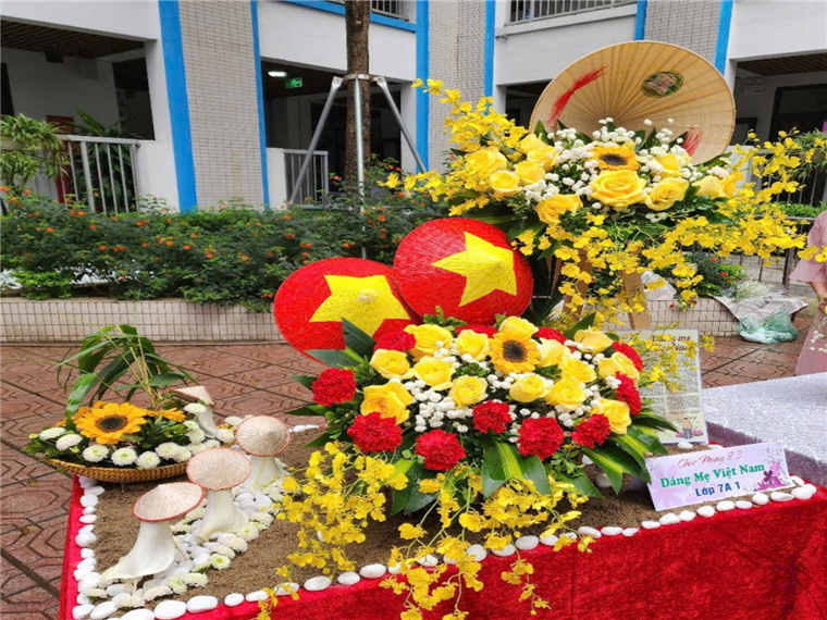 Trong vô vàn những lẵng hoa tươi sắc thắm, thơm sắc nồng ấy, em lại đặc biệt ấn tượng nhất với lẵng hoa của tập thể lớp mình- lớp 7A1. Tác phẩm cắm hoa có tên: " Dáng mẹ Việt Nam". Nhìn từ xa, lẵng hoa của lớp 7A1 không chỉ đẹp về hình thức mà còn chưa đựng nhiều ý nghĩa sâu sắc về tình mẫu tử, về đức hy sinh cao, về lòng yêu nước, tinh thần kiên trung của những người mẹ đã gắn bó trọn đời với quê hương, đất nước. Lẵng hoa uyển chuyển, mềm mại như tình mẹ dịu dàng nhưng cũng vững chãi như sự hy sinh không bao giờ đổi thay. Lẵng hoa mang ý nghĩa: "Dù thời gian trôi qua, dù cuộc sống có thay đổi, mẹ vẫn luôn là điểm tựa bình yên nhất, là nơi con có thể trở về sau mọi bão giông của cuộc đời."