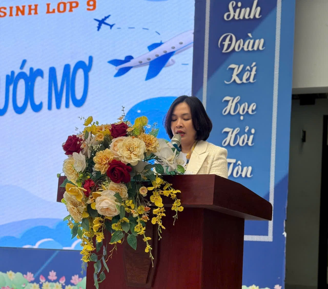 Mở đầu chương trình, cô giáo Nguyễn Ngọc Anh - Bí thư chi bộ, Hiệu trưởng nhà trường đã dành những lời tâm huyết chia sẻ với các em học sinh về định hướng tương lai nghề nghiệp của các em. Cô Ngọc Anh rất thấu hiểu rằng: lớp 9 là một cột mốc quan trọng trong hành trình học tập của mỗi học sinh. Đây là giai đoạn mà các em sẽ phải đối diện với quyết định quan trọng: chọn trường THPT và lựa chọn ngành nghề trong tương lai. Quá trình này không chỉ ảnh hưởng đến con đường học vấn mà còn định hình tương lai nghề nghiệp của các em. Cô mong rằng mỗi học sinh hãy tự khẳng định giá trị bản thân mình và có những hướng đi phù hợp để vững bước với những đam mê và luôn hạnh phúc trên con đường mà mình đã lựa chọn.