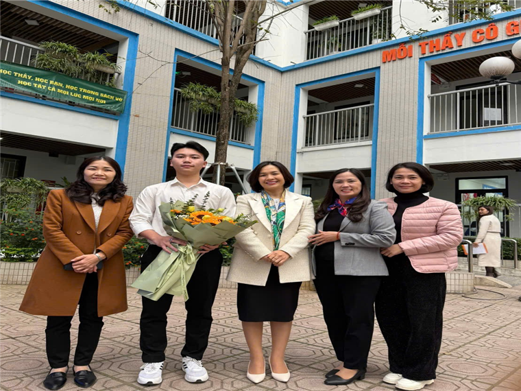 Cựu học sinh Nguyễn Tùng Anh (niên khóa 2017 -2021) bên các cô giáo trong Ban giám hiệu nhà trường và cô giáo chủ nhiệm cũ