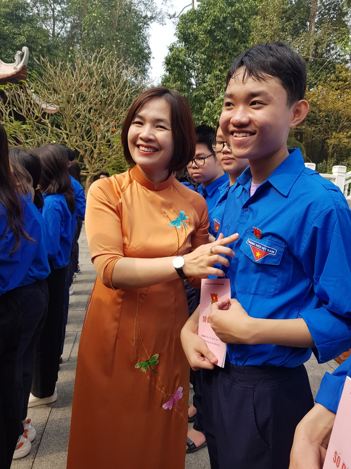 Cô giáo Nguyễn Ngọc Anh cài huy hiệu cho Đoàn viên mới