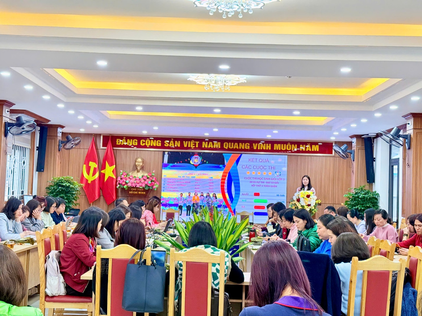 Bản báo cáo sơ kết học kì I được cô giáo Trần Thị Quỳnh Hương - Phó bí thư chi bộ, Phó hiệu trưởng nhà trường trình bày không chỉ bằng những số liệu, thành tích thông thường mà còn bằng cả một clip rất ấn tượng ghi lại một cách khái quát nhất những công việc mà toàn trường đã làm được trong những ngày tháng của học kì I.
