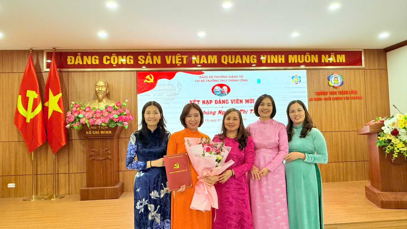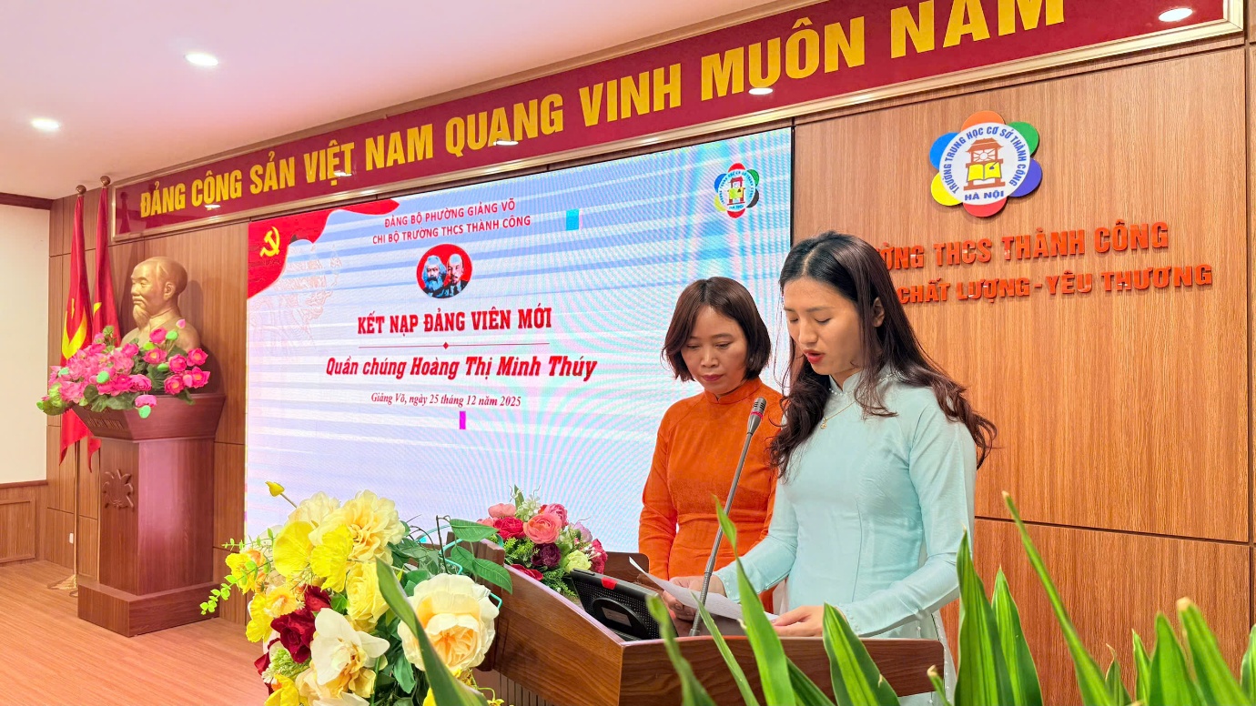Thực hiện Nghị quyết Đại hội Chi bộ Trường THCS Thành Công về công tác phát triển Đảng viên, ngày 15/01/2026, Chi bộ Trường THCS Thành Công đã long trọng tổ chức Lễ kết nạp Đảng viên mới cho 02 quần chúng ưu tú là đồng chí Hoàng Thị Minh Thúy và đồng chí Nguyễn Thị Tân. Đây là sự kiện có ý nghĩa quan trọng trong công tác xây dựng Đảng, góp phần phát triển lực lượng, nâng cao chất lượng và sức chiến đấu của Chi bộ nhà trường nói chung và của mỗi Đảng viên nói riêng.