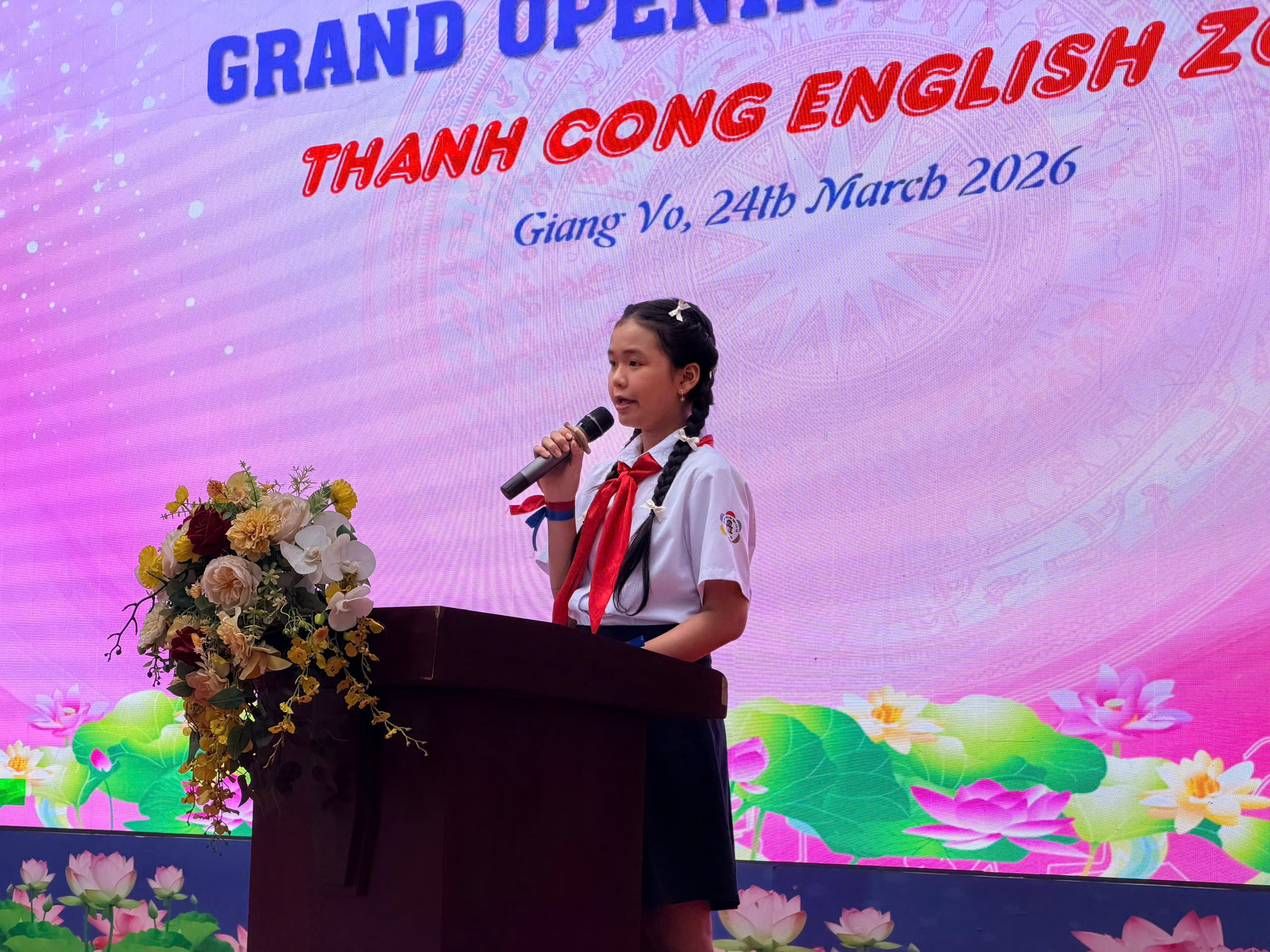 Phát biểu trong chương trình, em Nguyễn Thái Huyền Anh, học sinh lớp 6A chia sẻ: “từ hôm nay, nơi hành lang ấy đã trở thành một không gian mới, nơi chúng em có thể dừng lại, lắng nghe, cất lời và tự tin thể hiện bản thân bằng tiếng Anh. Chúng em thực sự xúc động khi nhận ra rằng, nhà trường và các thầy cô không chỉ dạy chúng em kiến thức, mà còn luôn tâm huyết trong việc tạo ra những cơ hội để chúng em được trải nghiệm, được trưởng thành. “English Zone” không chỉ là một góc học tập, mà còn là một món quà một cơ hội quý giá để chúng em rèn luyện, khám phá và bước ra khỏi sự e ngại của chính mình.”