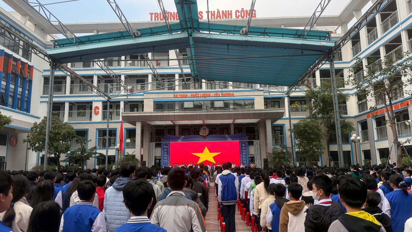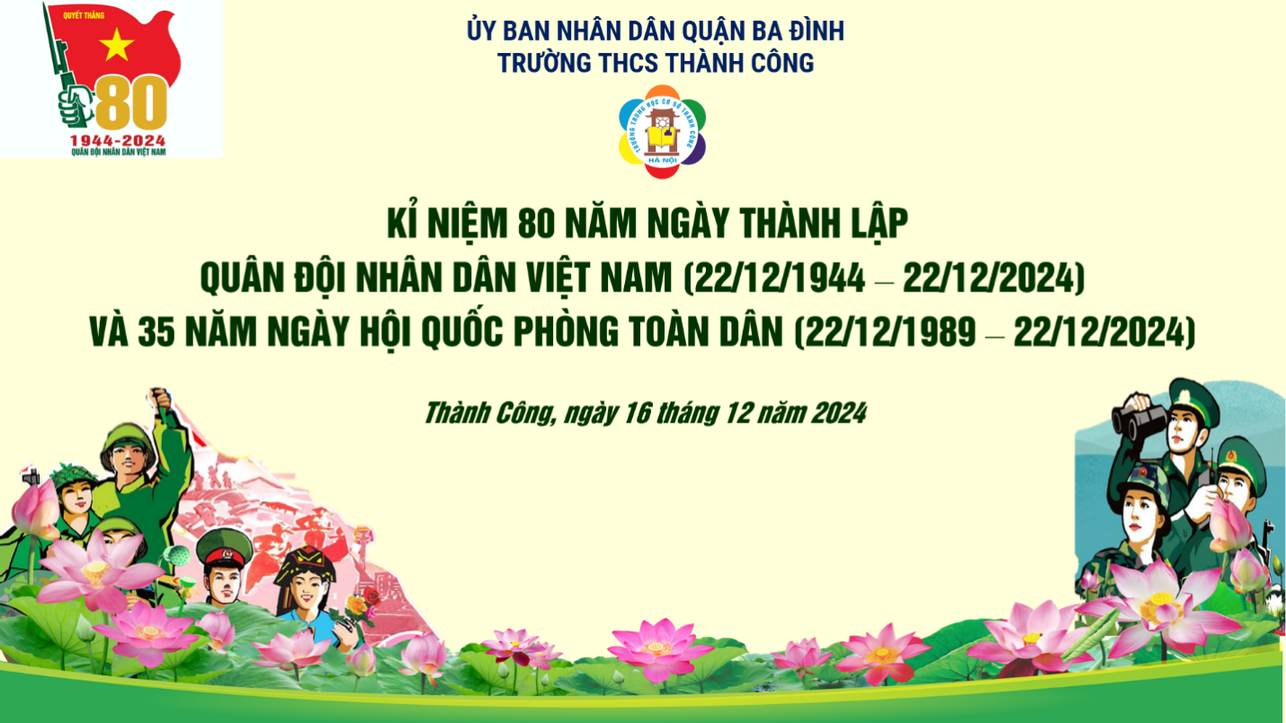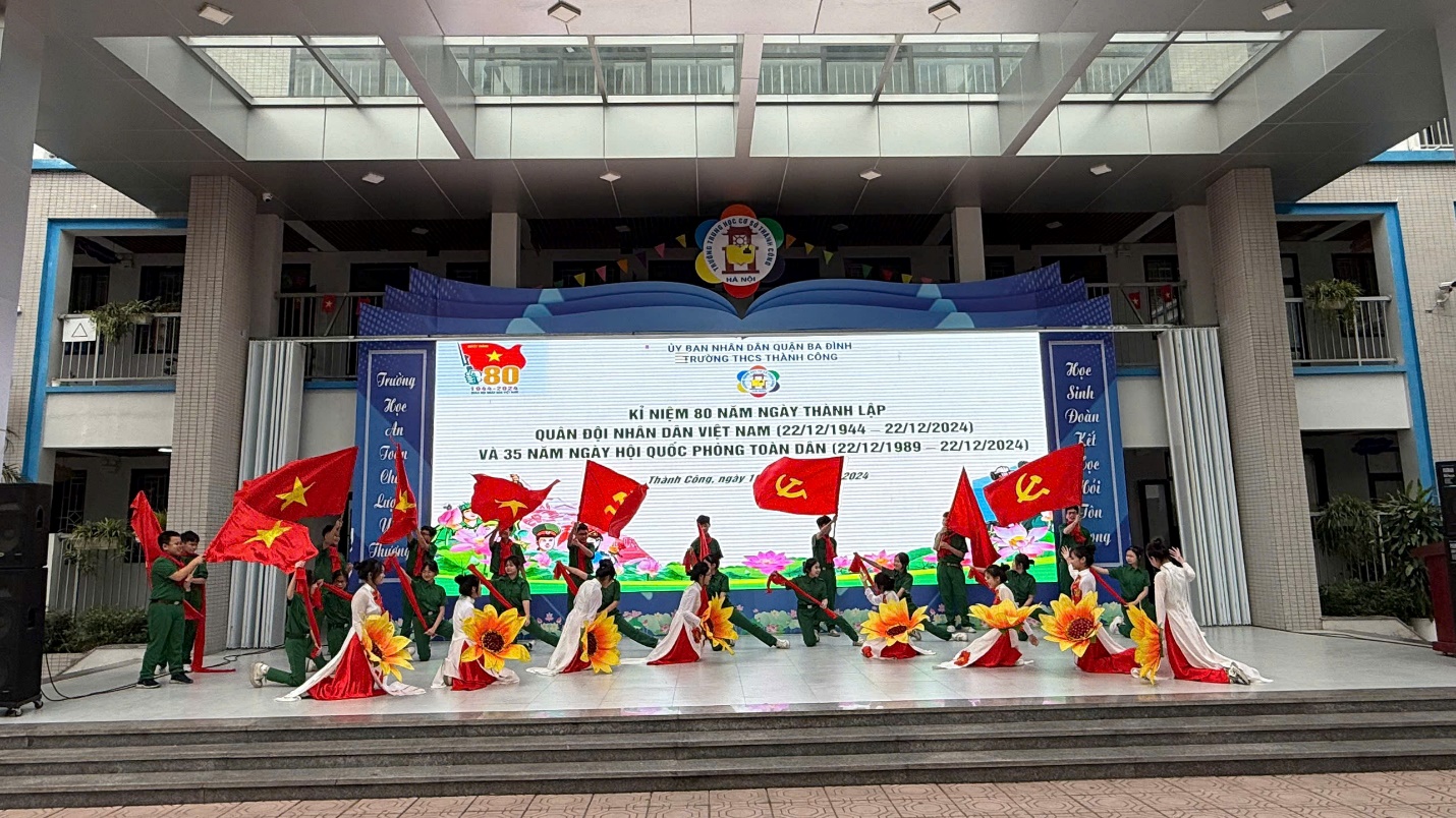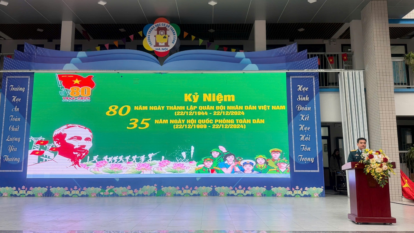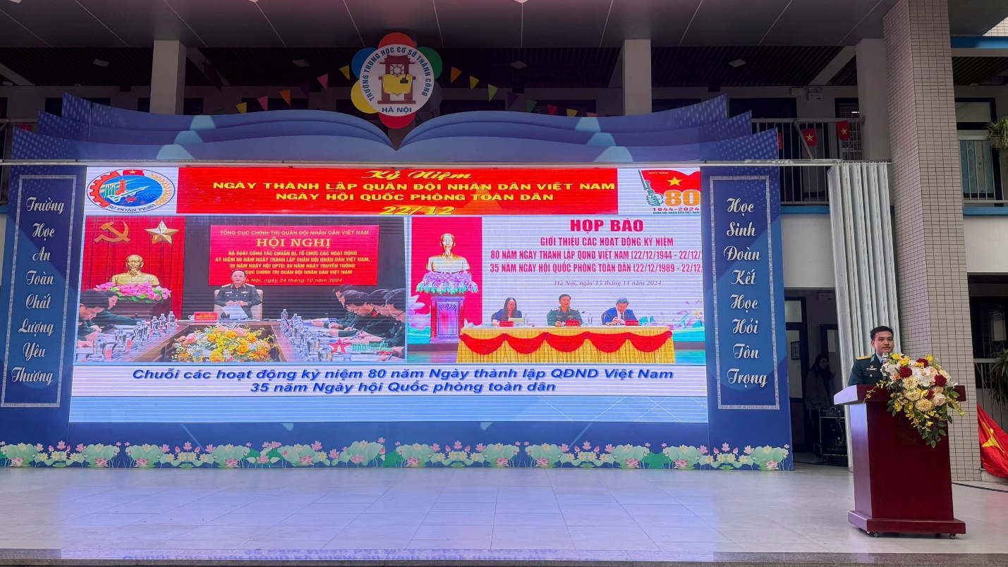 Hòa chung trong không khí của cả nước hướng về Kỉ niệm 80 năm Ngày thành lập Quân đội nhân dân Việt Nam (22/12/1944 - 22/12/2024) – 35 năm Ngày hội quốc phòng toàn dân – 78 năm Ngày toàn quốc kháng chiến (19/12/1946 - 19/12/2024), sáng ngày 16/12/2024 trường THCS Thành Công đã tổ chức buổi sinh hoạt dưới cờ với các hoạt động ý nghĩa nhằm bày tỏ tình cảm với các thế hệ chiến sĩ đã và đang chiến đấu vì nền độc lập, vì chủ quyền thiêng liêng của Tổ Quốc. Tham dự chương trình có thiếu tá Trần Văn Nguyên – Cán bộ phòng Chính trị Sư đoàn Phòng không 361 - đơn vị kết nghĩa với nhà trường, các cô giáo trong Ban Giám hiệu nhà trường cùng các thầy cô giáo, các con học sinh trường THCS Thành Công.