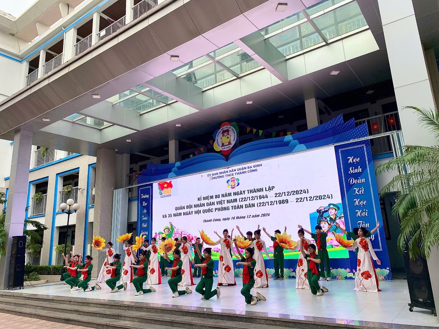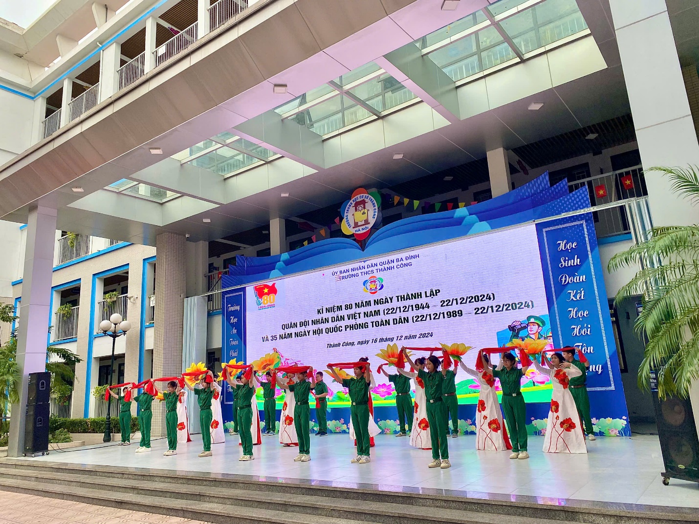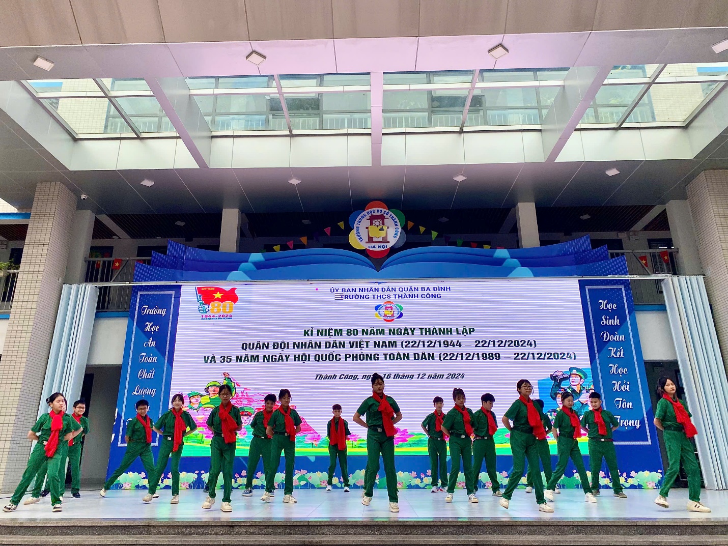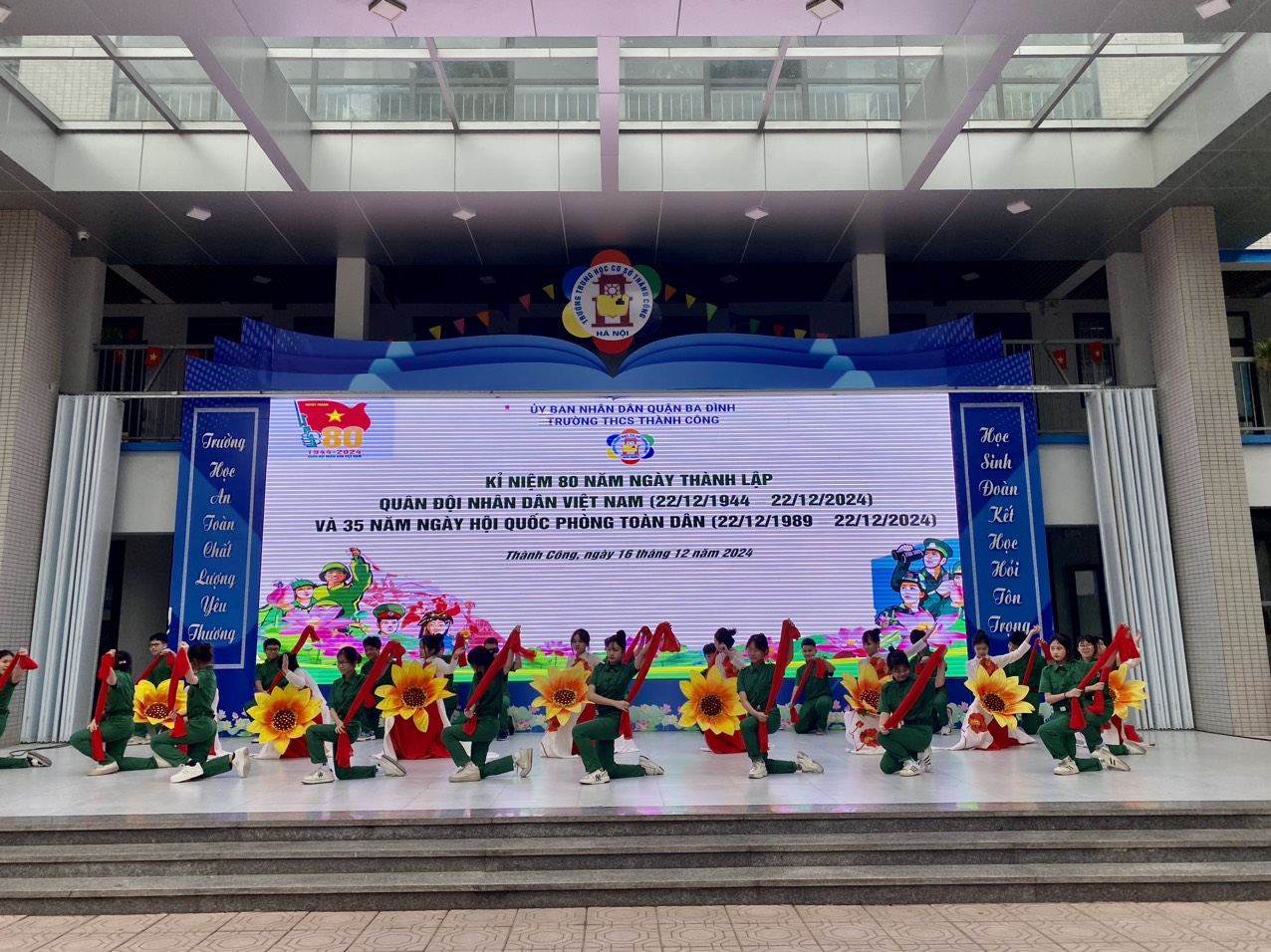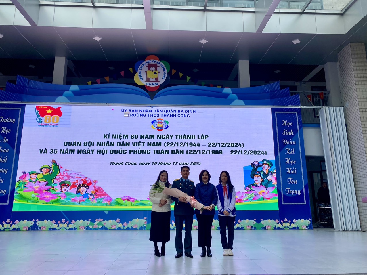Hòa chung trong không khí của cả nước hướng về Kỉ niệm 80 năm Ngày thành lập Quân đội nhân dân Việt Nam (22/12/1944 - 22/12/2024) – 35 năm Ngày hội quốc phòng toàn dân – 78 năm Ngày toàn quốc kháng chiến (19/12/1946 - 19/12/2024), sáng ngày 16/12/2024 trường THCS Thành Công đã tổ chức buổi sinh hoạt dưới cờ với các hoạt động ý nghĩa nhằm bày tỏ tình cảm với các thế hệ chiến sĩ đã và đang chiến đấu vì nền độc lập, vì chủ quyền thiêng liêng của Tổ Quốc. Tham dự chương trình có thiếu tá Trần Văn Nguyên – Cán bộ phòng Chính trị Sư đoàn Phòng không 361 - đơn vị kết nghĩa với nhà trường, các cô giáo trong Ban Giám hiệu nhà trường cùng các thầy cô giáo, các con học sinh trường THCS Thành Công.