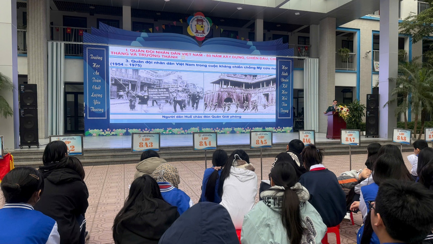 Thiếu tá chia sẻ chặng đường 80 năm của Quân đội nhân dân Việt Nam đến các con học sinh khối 6, 7, 8, 9
