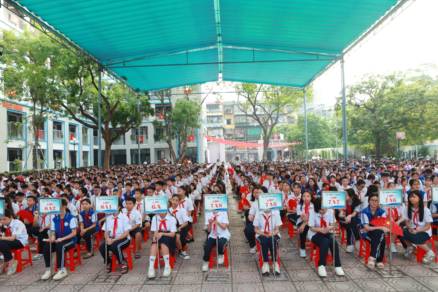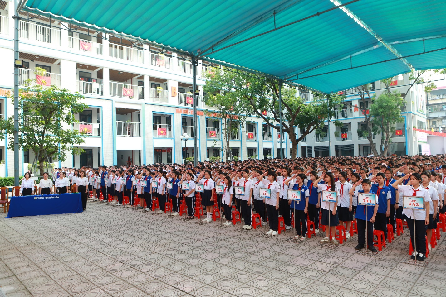Dưới ánh nắng nhẹ của buổi sáng sớm, sân trường đông đúc học sinh nhanh chóng ổn định thành các hàng lối chỉnh tề sau hiệu lệnh của các thầy cô. Học sinh nào cũng tươi tắn diện áo trắng đồng phục, quàng khăn đỏ xếp hàng theo lớp một cách trật tự. Tiết sinh hoạt đầu tiên của năm học mới tại trường THCS Thành Công diễn ra trong bầu không khí trang trọng, nghiêm túc. Đội nghi thức chỉnh tề hàng ngũ, cất vang tiếng kèn hiệu; các lớp học sinh nghiêm trang chào cờ, mạnh mẽ hát khúc Tiến quân ca cùng các thầy cô giáo.