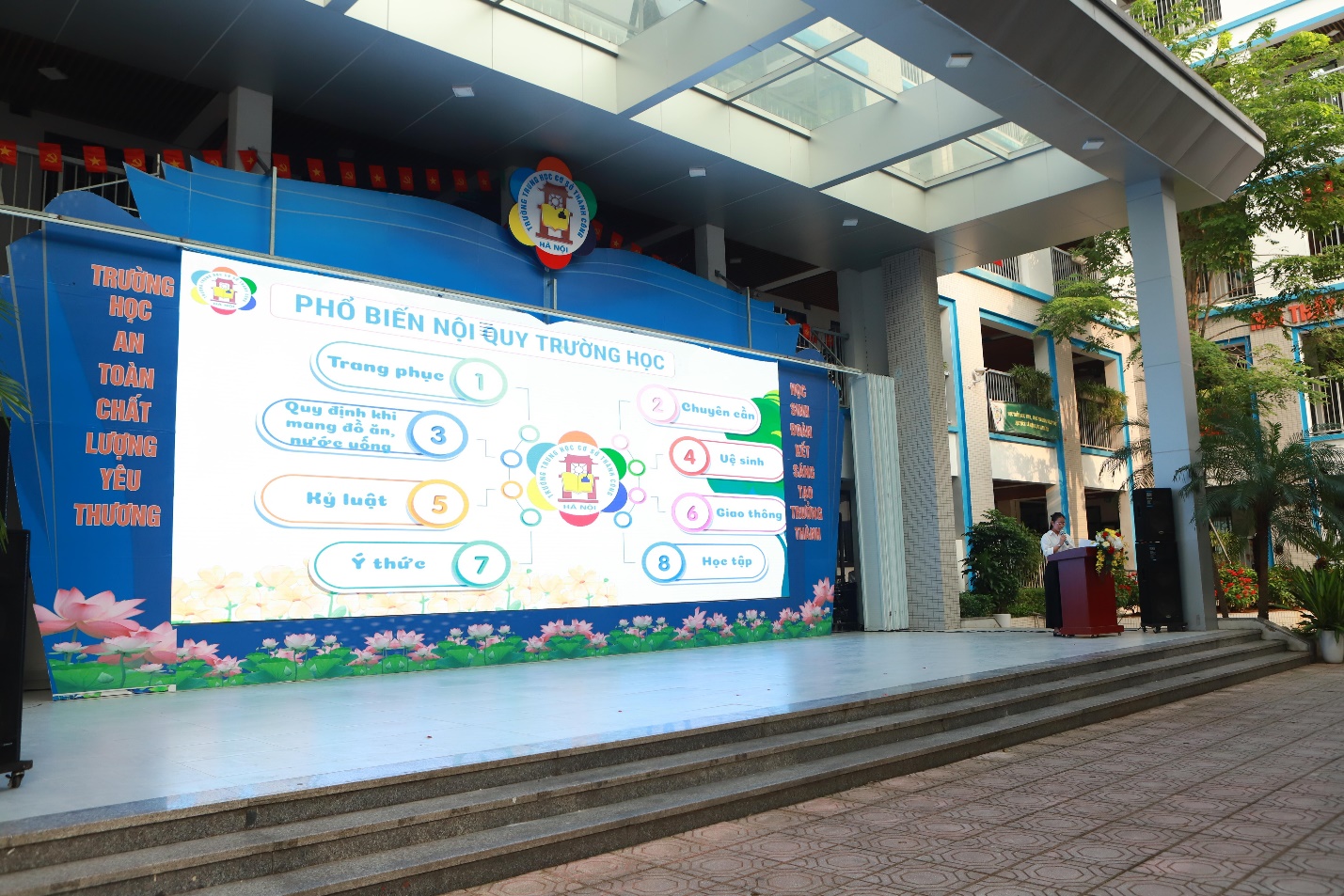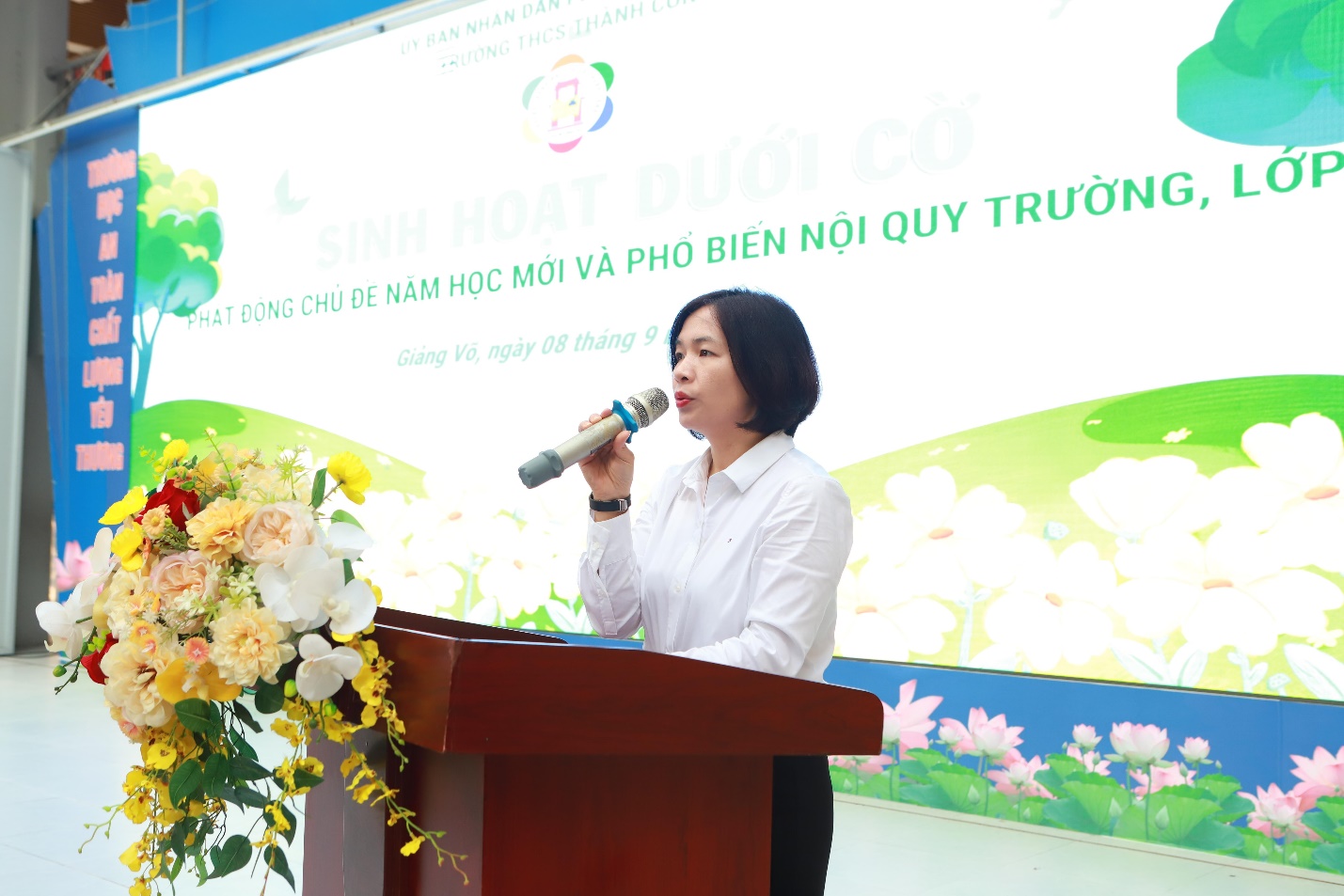 Trong không khí hứng khởi bước vào năm học mới, nhà giáo Nguyễn Ngọc Anh - Bí thư Chi bộ, Hiệu trưởng nhà trường - nhấn mạnh việc phát động chủ đề năm học mới và phổ biến nội quy chính là nền tảng để xây dựng môi trường giáo dục An toàn – Chất lượng – Yêu thương, giúp học sinh Thành Công học tập, rèn luyện và trưởng thành toàn diện. Đặc biệt, nhà trường đã đưa ra phương châm hoạt động một cách cụ thể, thiết thực và phù hợp với tập thể cán bộ, giáo viên, nhân viên, học sinh toàn trường. Cô Ngọc Anh cũng tin tưởng rằng, với tinh thần đoàn kết và quyết tâm của thầy và trò, Trường THCS Thành Công sẽ hoàn thành xuất sắc nhiệm vụ năm học 2025 – 2026, tiếp tục khẳng định vị thế lá cờ đầu trong phong trào thi đua dạy và học.