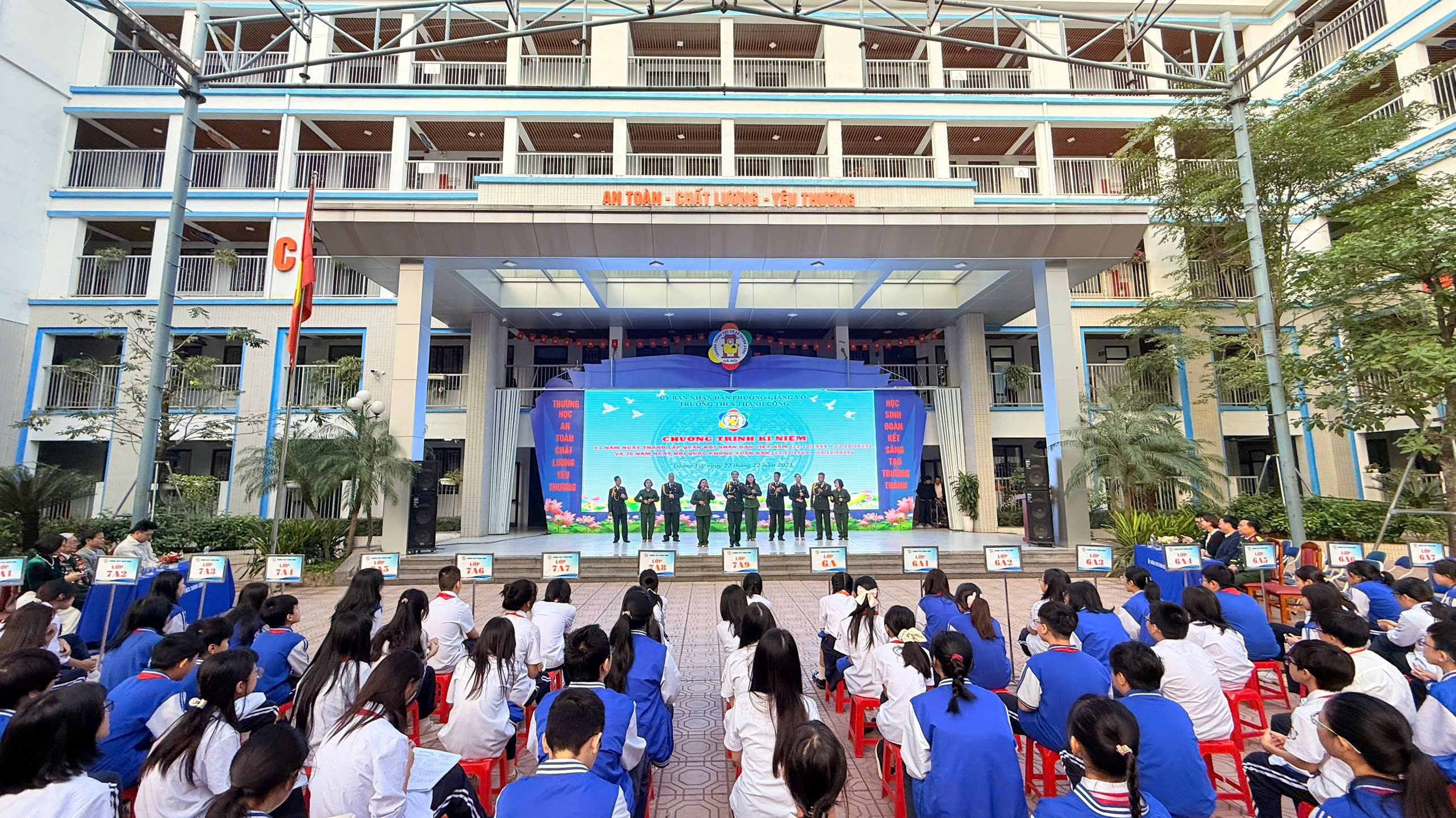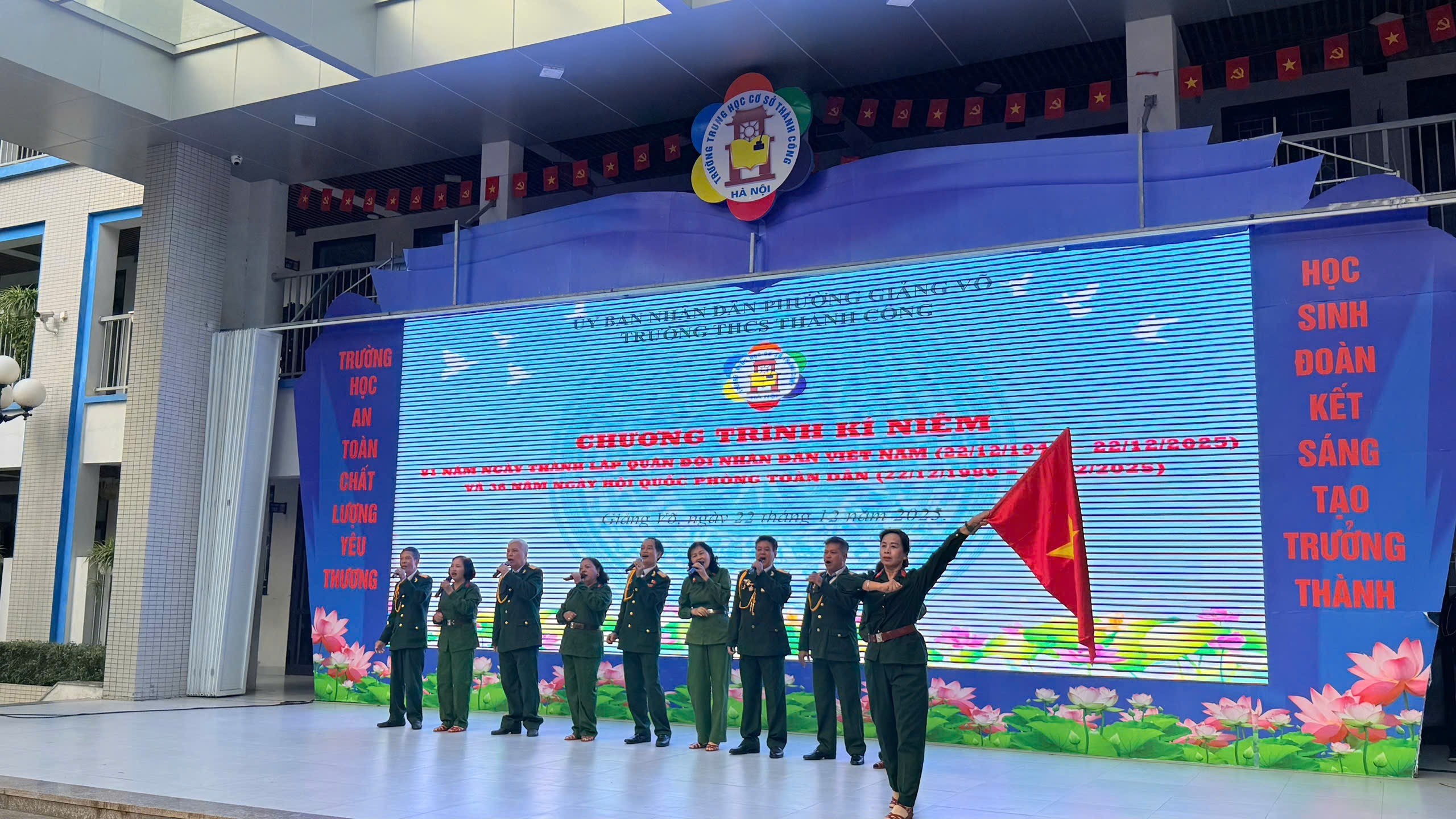 Trong không khí trang nghiêm và tự hào của những ngày tháng 12 lịch sử, sáng nay 22/12/2025, trường THCS Thành Công (phường Giảng Võ) đã tổ chức tiết sinh hoạt dưới cờ đặc biệt chào mừng 81 năm Ngày thành lập Quân đội Nhân dân Việt Nam (22/12/1944 - 22/12/2025) và 36 năm Ngày hội Quốc phòng toàn dân. Chương trình là nhịp cầu kết nối giữa quá khứ hào hùng và thế hệ tương lai thông qua cuộc gặp gỡ đầy ý nghĩa với các bác Cựu chiến binh.