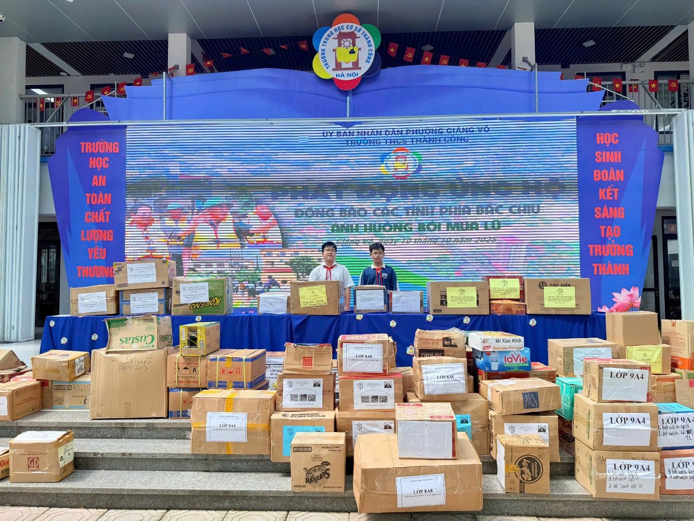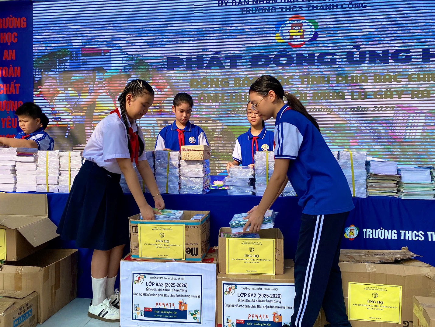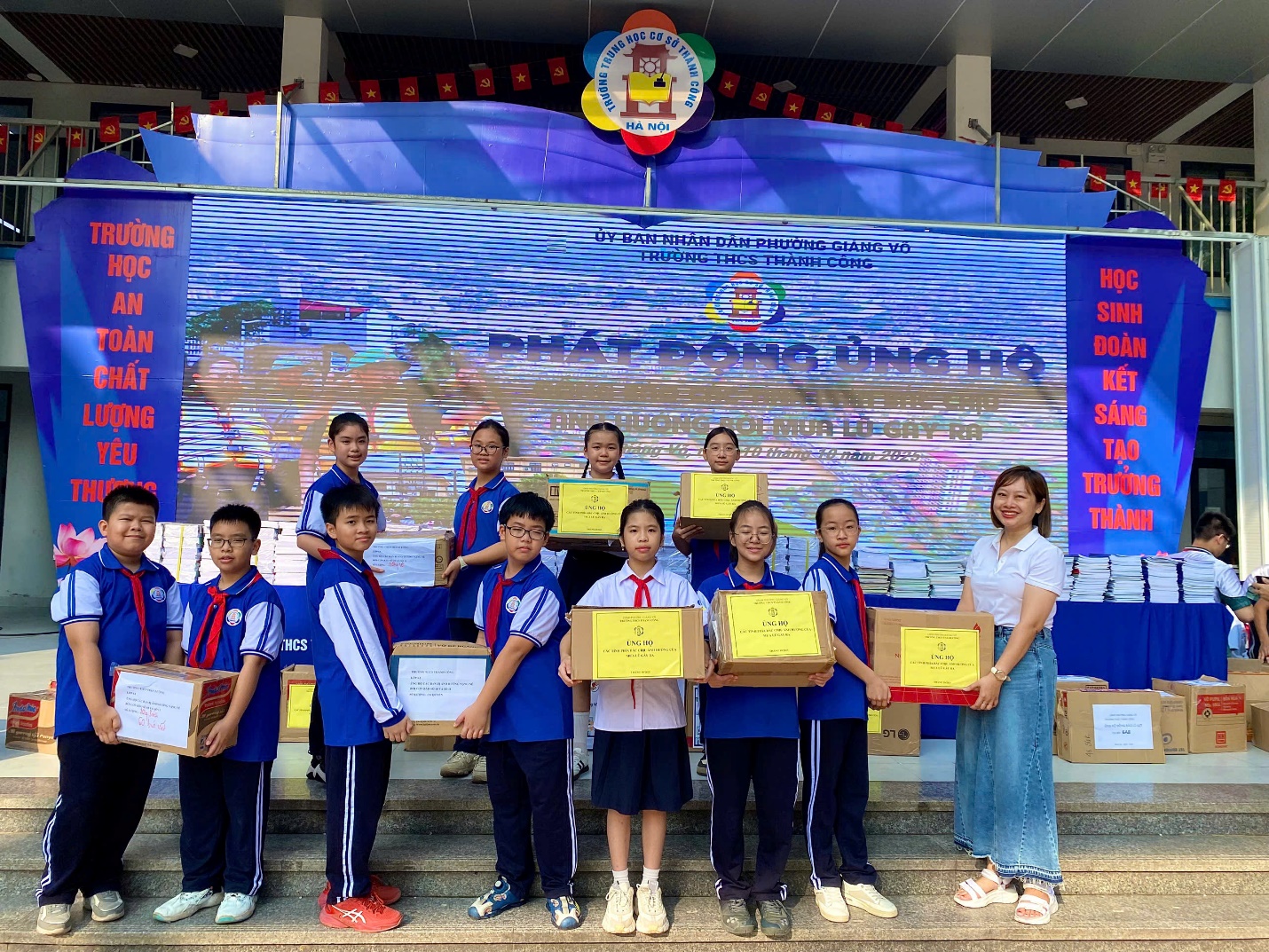 Tại buổi phát động, những thùng sách vở, đồ dùng học tập… đã được trao đi trong tinh thần “Lá lành đùm lá rách” , “Một miếng khi đói bằng một gói khi no”. Mỗi món quà, dù nhỏ bé, đều chứa đựng tấm lòng sẻ chia, yêu thương và trách nhiệm xã hội của thầy trò trường THCS Thành Công gửi đến đồng bào vùng bão lũ.
